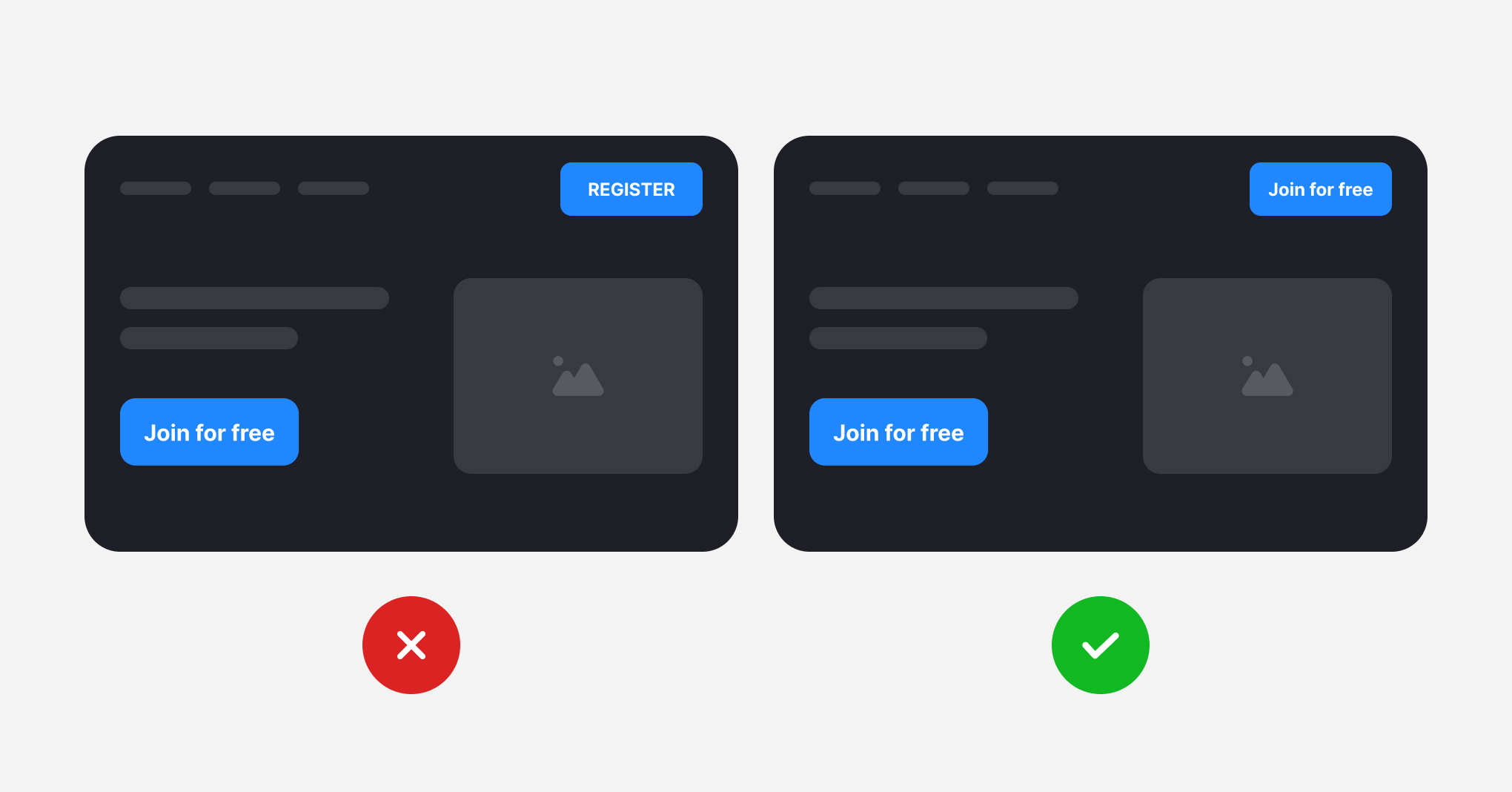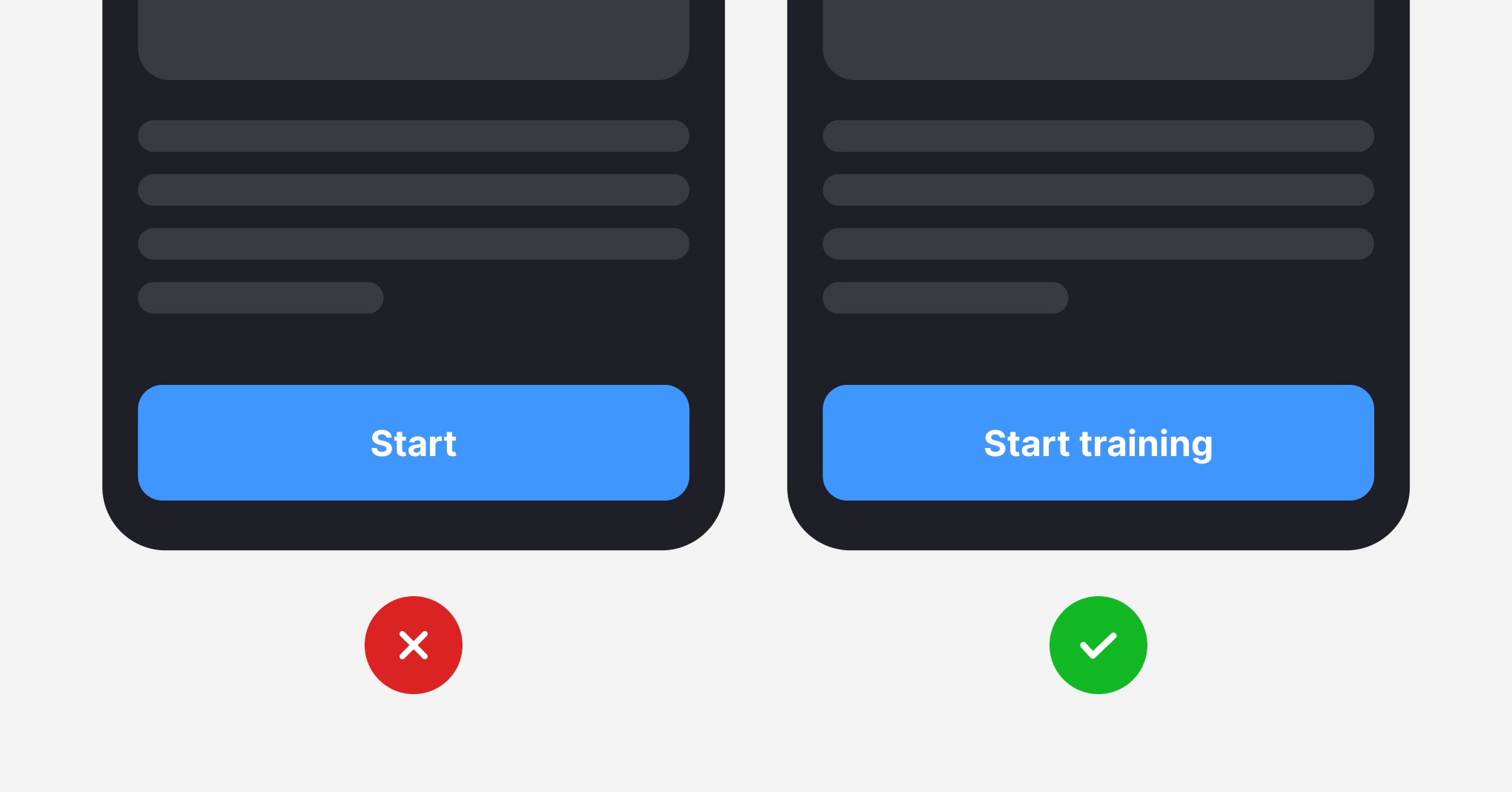 While a good CTA tells users what will happen when they click the button, a great CTA also tells them why they should do it. People who create apps usually think of them as functions to develop. What does this button do? It lets you register. But to understand the benefit for users, ask yourself why users should tap this particular button. If it's a fitness app, they want to start training. Flight aggregator users wish to find, compare, and buy tickets. Recipe website users want to explore recipes. Whatever the benefit is, emphasizing it in the CTA improves conversion rates.