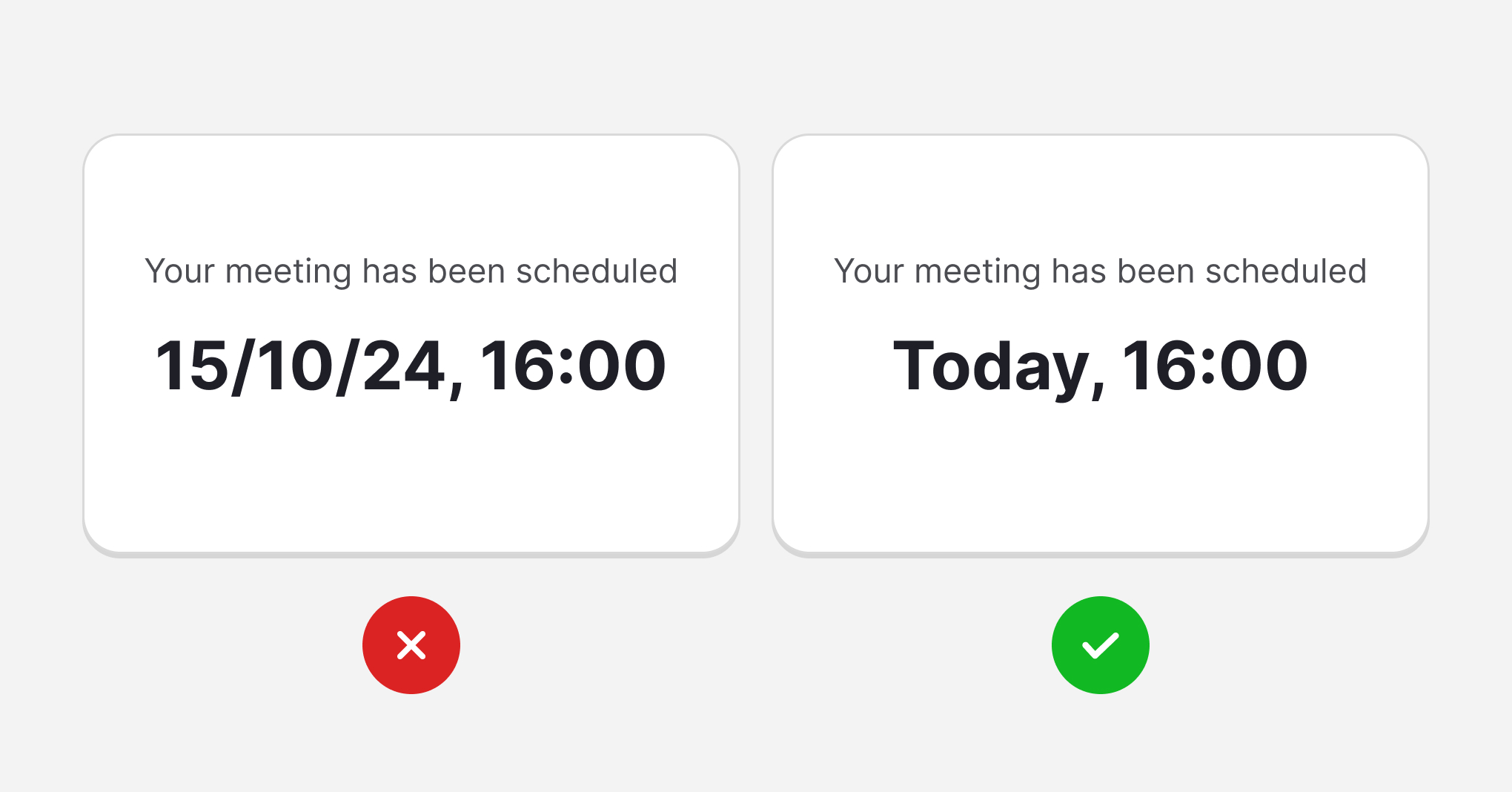 Sometimes UX writers joke that developers often aren't good at writing microcopy because they are used to communicating with computers. While the system stores dates as numeric values, humans have special words for days close to our present. In a conversation, we rarely refer to the day after today as a date. For example, it's not "April 1" but "tomorrow." You can reduce users' cognitive load by using the words of natural language: today, tomorrow, and yesterday.