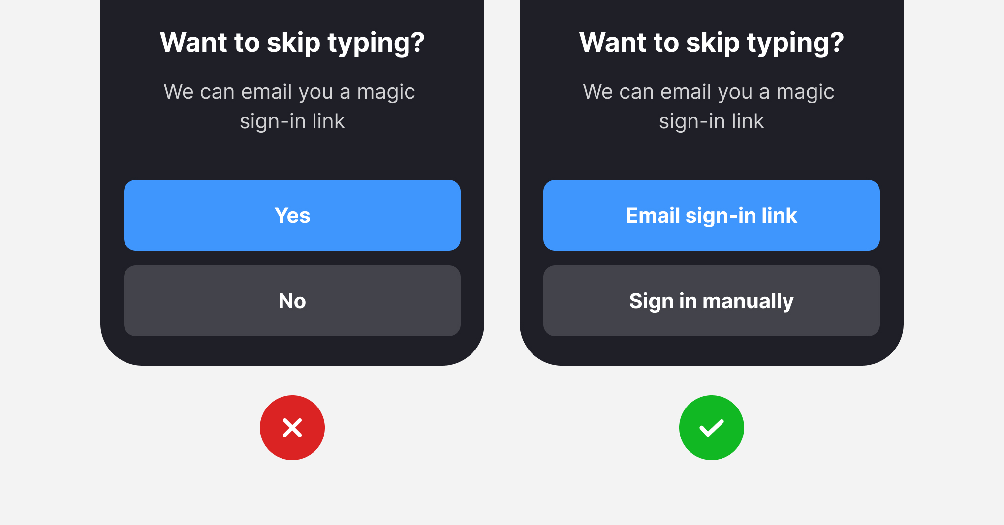 Informative CTAs encourage users to take a specific action and clarify where that action will take them. Imagine creating a dialog screen with a yes/no question in the headline — for example, "Want to skip the typing?" The answer to the question we expect could be "yes" or "no," which appears in many CTAs. Unfortunately, button labels like this aren't all that helpful to users.