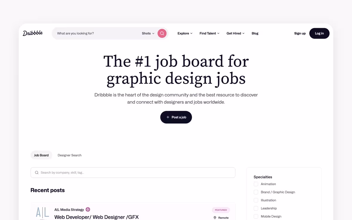 While you may be familiar with Dribbble as a source of design inspiration, it's primarily a website for designers and illustrators to upload their work, create a portfolio, demonstrate their skills, and finally, find a job. Dribbble has two platforms: one is for freelance designers and the other is for those looking for a full-time job, including remote options. The latter provides various design roles for senior, mid-level, junior, and even some entry-level designer positions.