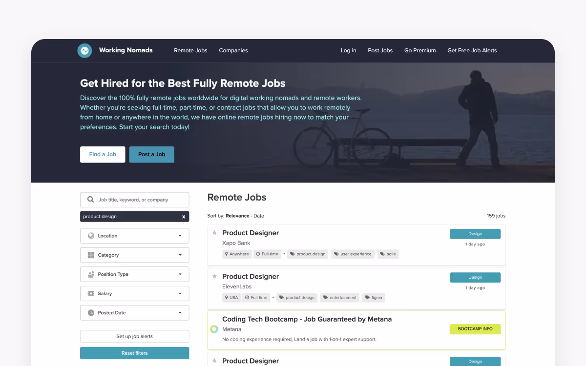 "Nomad" is a word used to describe people who don't settle and move from one place to another; in other words, remote workers. The platform offers lists of the most interesting remote job offers in many career areas like UX design, UI design, product design, graphic design, programming, marketing, management, writing, health care, education, and more. The website doesn't offer an advanced filtering system, so you need to go through the whole listing to find what you need. Otherwise, you can subscribe to a newsletter to view relevant job positions.