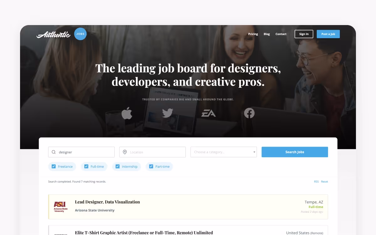 Authentic Jobs is another job board resource worth checking. It was founded to help designers, developers, and other creative professionals find full-time, part-time, remote, or freelance jobs and internships in any corner of the world. On each job description page, you'll find recommendations of related jobs that might interest you. Applying for a job requires visiting the company's website to complete the application process there.