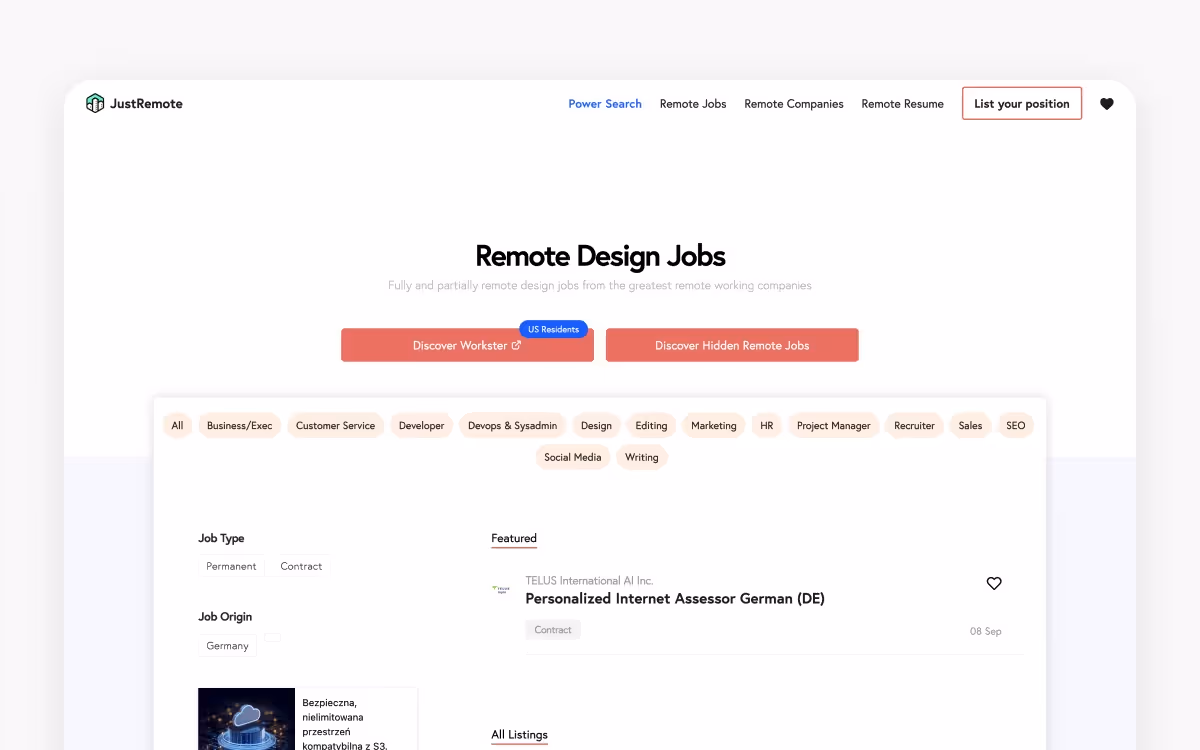 Just Remote is another helpful resource for finding a remote position in any sphere of the information technology industry, including design. A premium membership provides access to the most appealing job openings that aren't advertised and hidden from the main search.