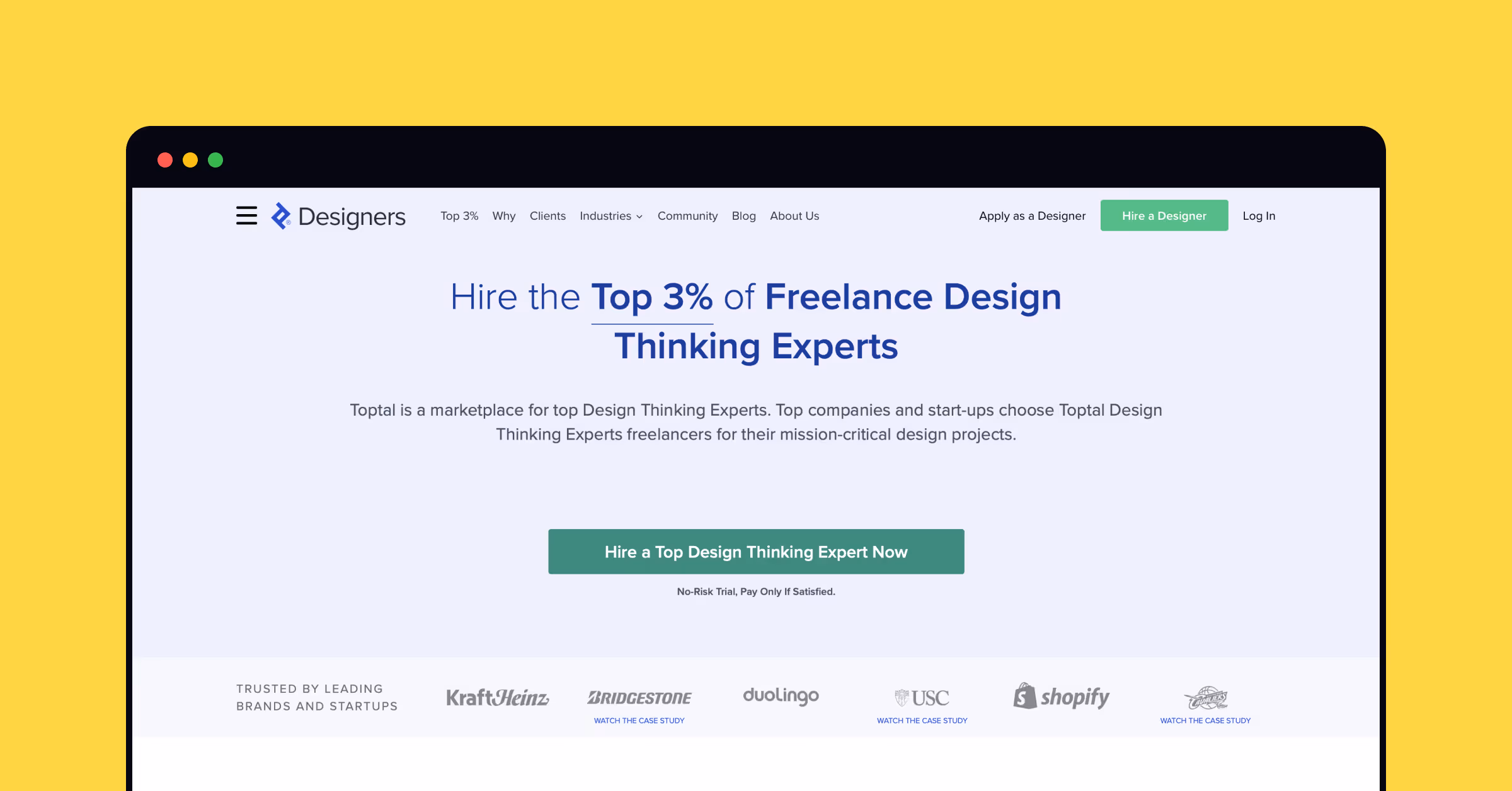 Toptal is a marketplace for freelancers working remotely worldwide. You can find a pool of 200,000 candidates screened for technical expertise and soft skills. One of Toptal’s best features is its custom matching algorithm that registers your needs and team dynamics to connect you with the best fit UX designers.