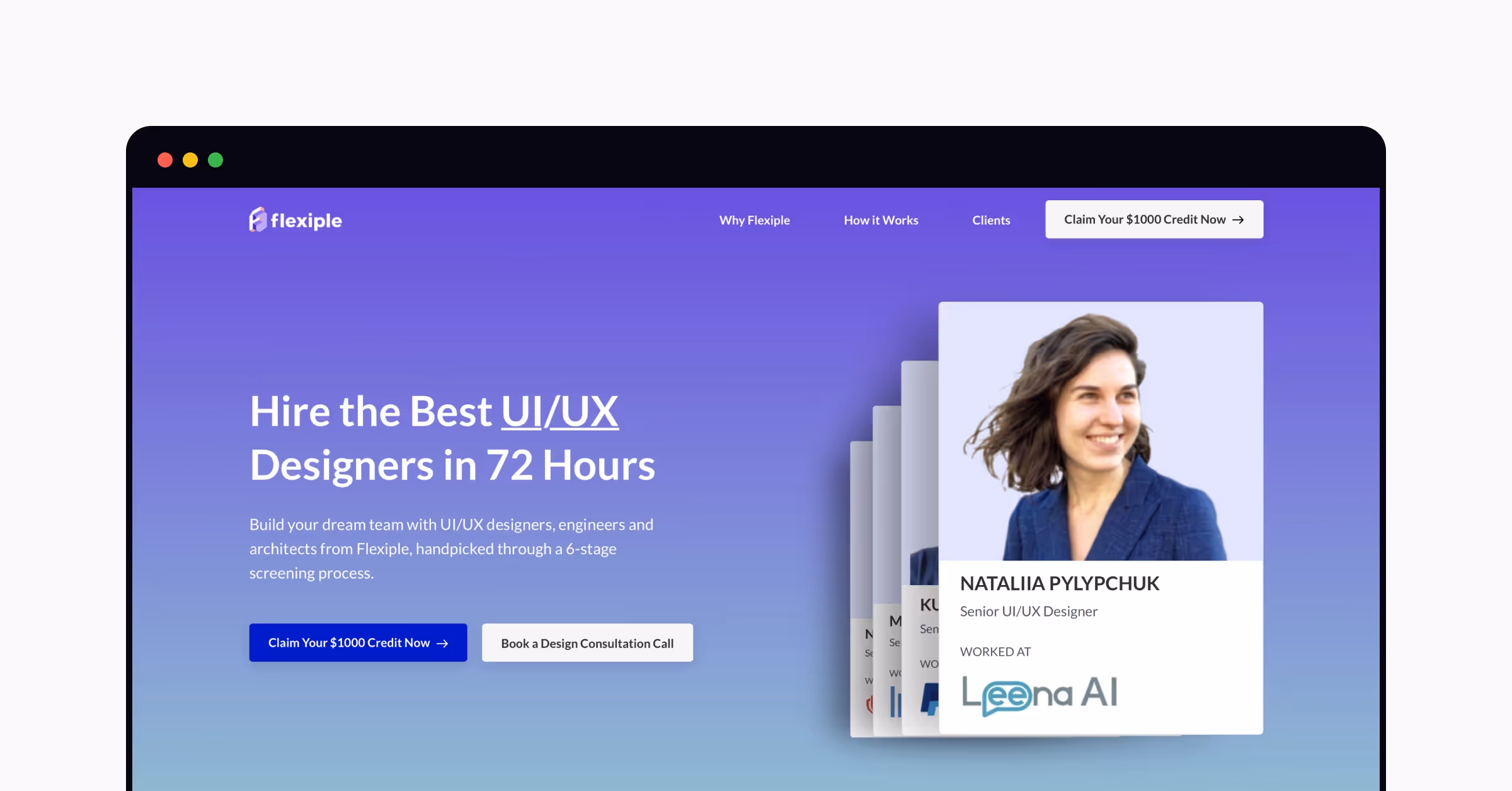 - Thoroughly vetted designers: Flexiple’s unique value proposition is its extensive screening process to offer the most high-quality talent to all clients.