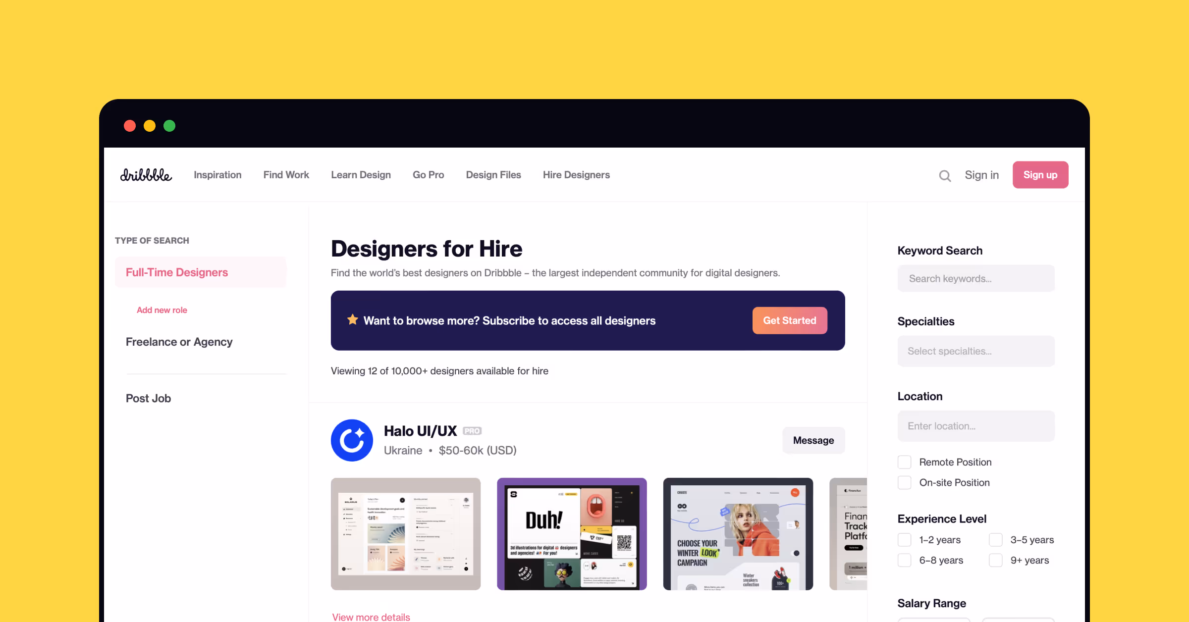 Despite its massive database of UX designers, Dribbble might not be the best choice for you to hire vetted candidates. The platform doesn’t have a defined process for onboarding designers or testing their skills.