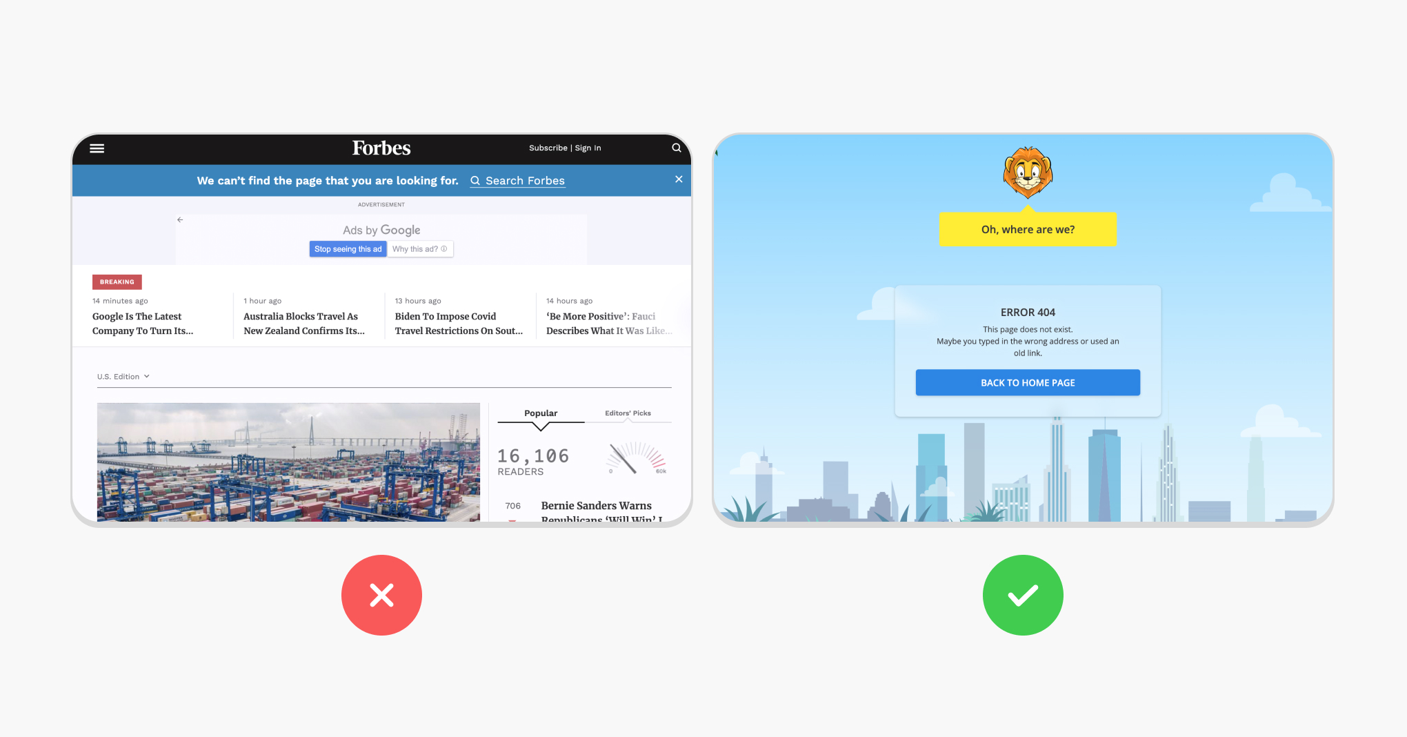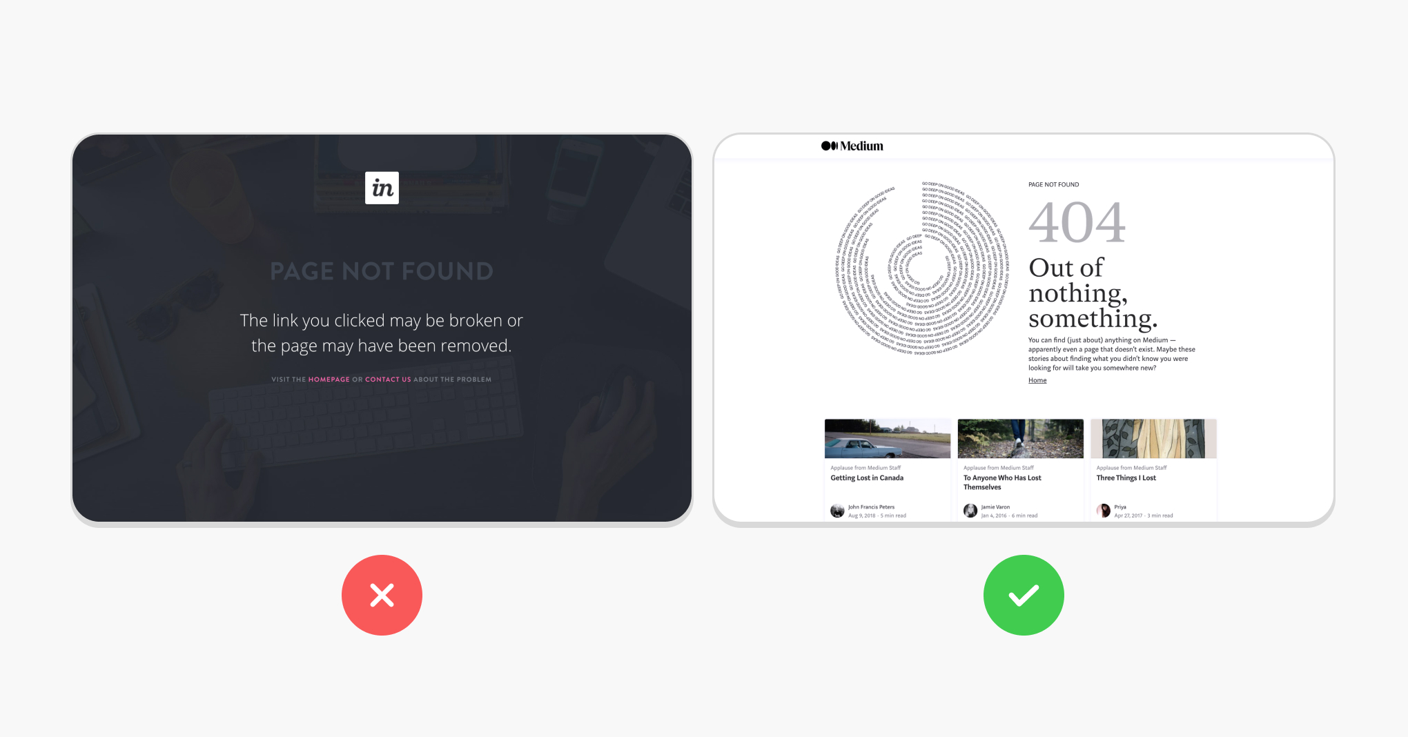 The worst way to present a 404 page is to offer no explanation. Brands can certainly do better than a dismissable banner. In fact, one of Jacob Nielsen's heuristics says that the right product should help users recognize, diagnose, and recover from errors. When a 404 error happens, don't miss a chance to turn it into a win.
