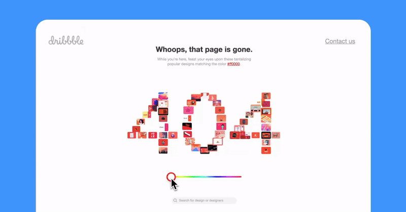 Each one of us has an inner child who likes to come out and play when we are bored. So why not create a 404 page to amuse users and keep them busy? One of the best examples is the Dribbble error page. It randomly picks a color and shows Dribbble artworks that might interest viewers and inspire them to explore the website. A search input that turns it into an interactive experience is the icing on the cake!