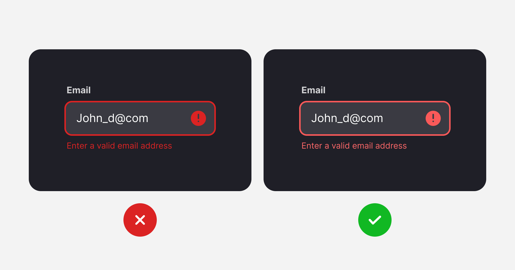 Error messages in apps are similarly important. That's why they should have high color contrast and be immediately recognizable. Material Design recommends using a semi-transparent overlay with 40% opacity over the light mode's red for errors. The original error color is #B00020, which is transformed to #CF6679 by overlaying 40% white. It now meets AA-level contrast standards in dark mode.