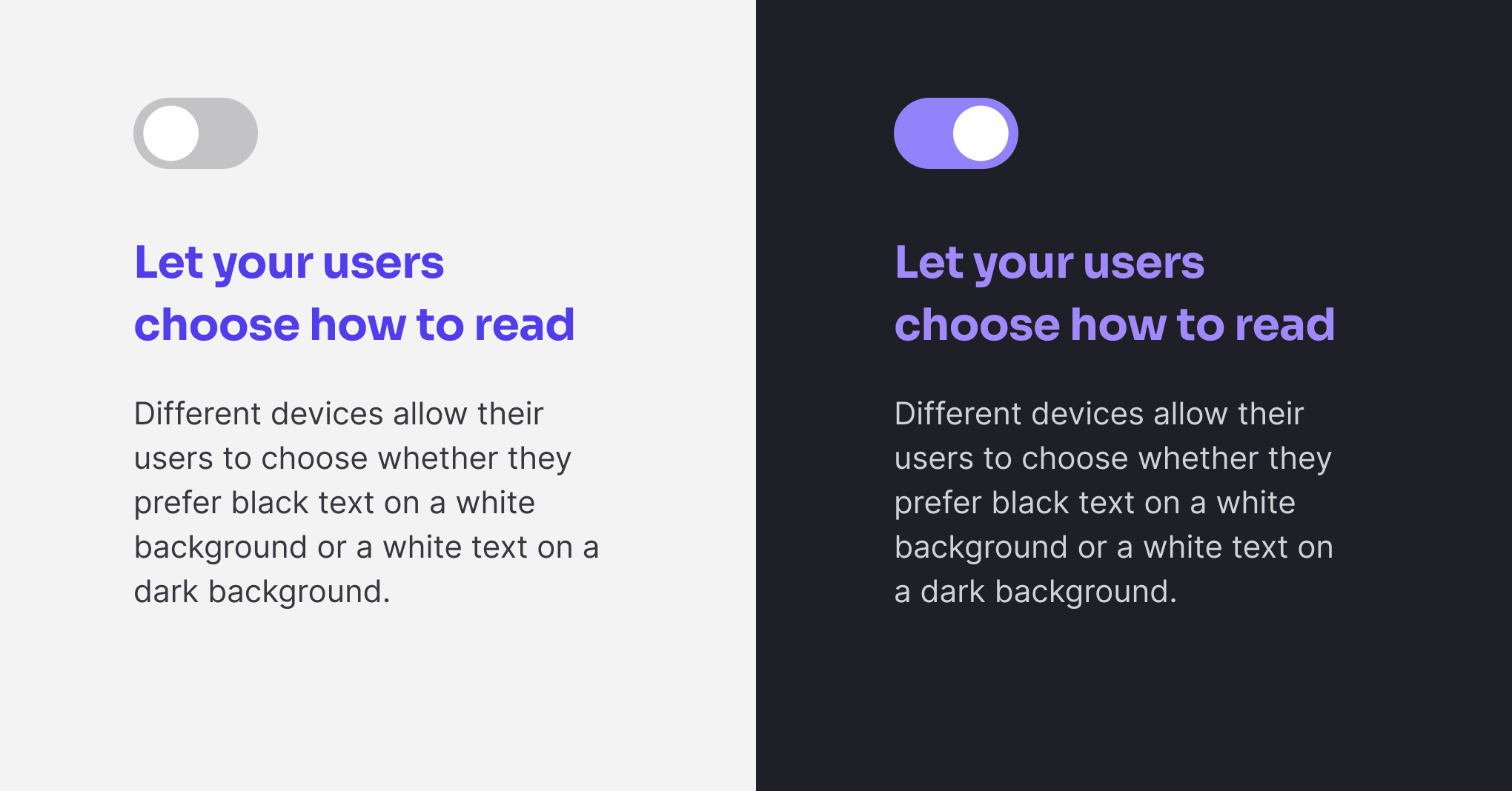 Keep in mind that users love having a choice and being in control. So, provide them the option to change defaults and turn dark mode on and off! Offering both light and dark themes can significantly enhance user experience and engagement, as it caters to different preferences and needs.