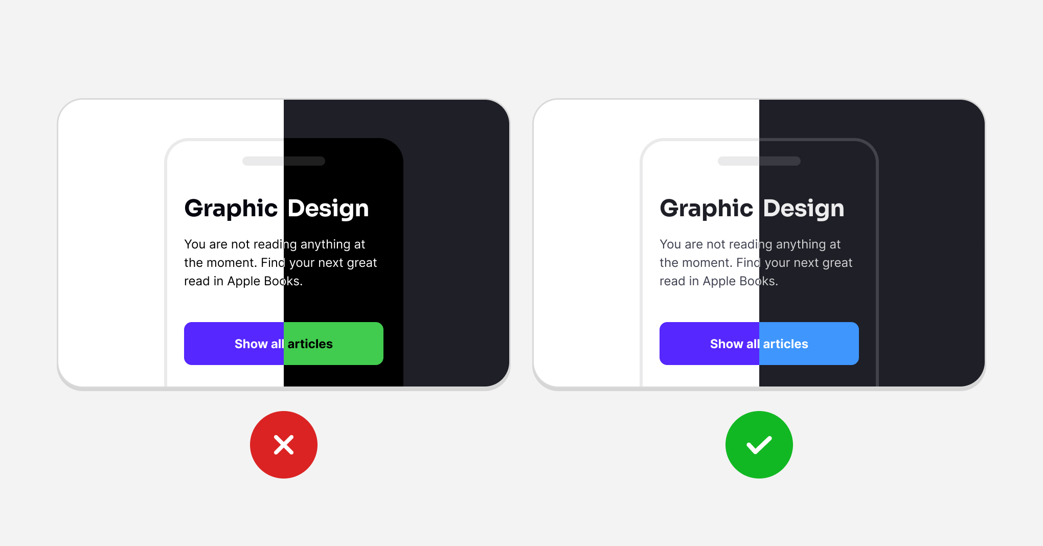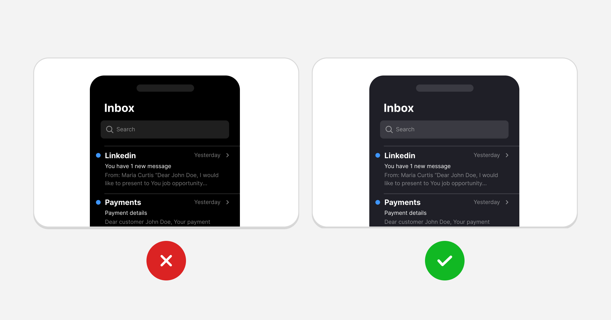 The best practice in dark mode is to create elevation. You can do this by developing a system of layers with lighter colors for higher levels and darker for lower ones. Another way to do this is to apply an overlay with varying transparency for the same result. Use higher levels of transparency for important elements like buttons and lower levels for background.