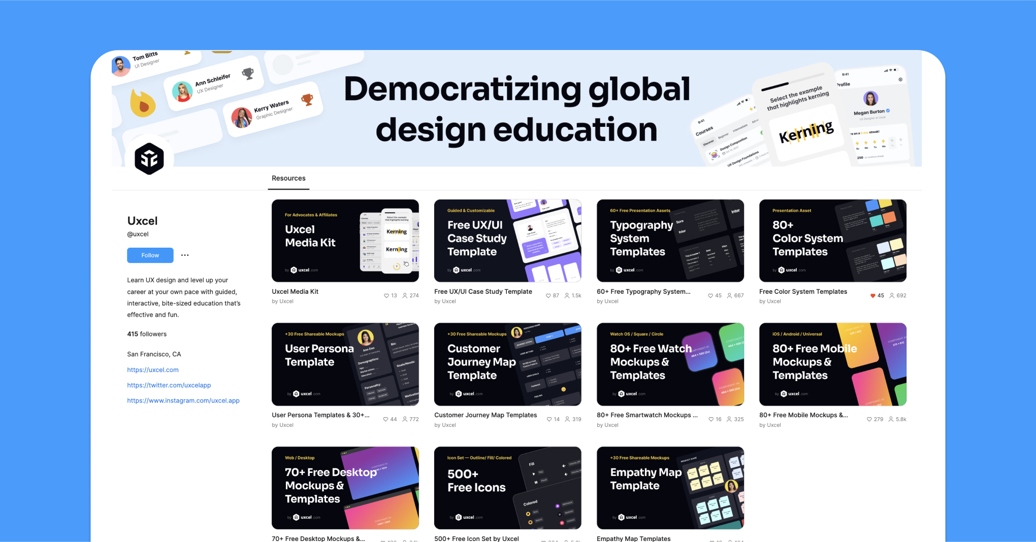 Use the provided Uxcel templates to showcase your designs with mockups and create a prominent cover image with attractive visuals and a compelling title.