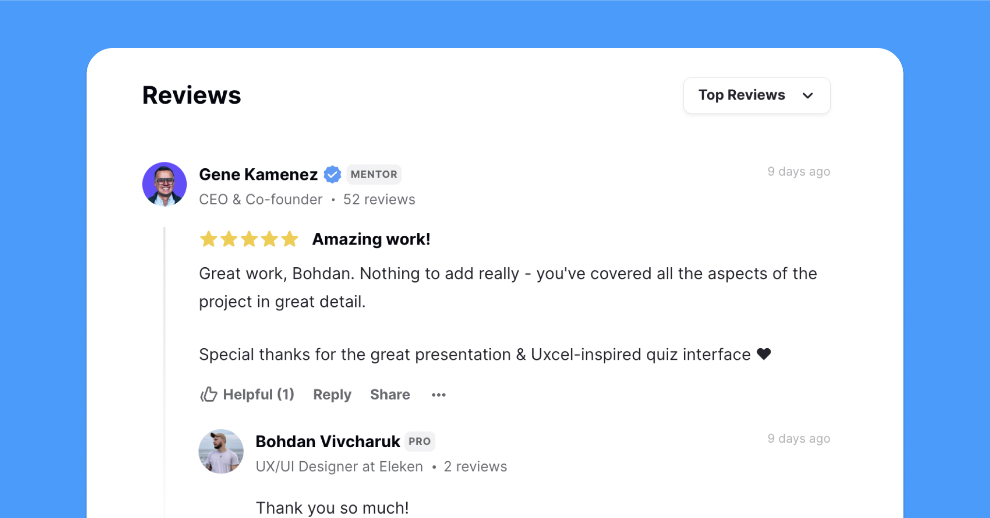 Remember, receiving valuable feedback from Uxcel’s community starts with giving thoughtful feedback to others. While clapping to show appreciation for someone's work is a quick way to encourage them, leaving written feedback is far more impactful. Thoughtful comments not only help others improve but also foster meaningful connections within the community.