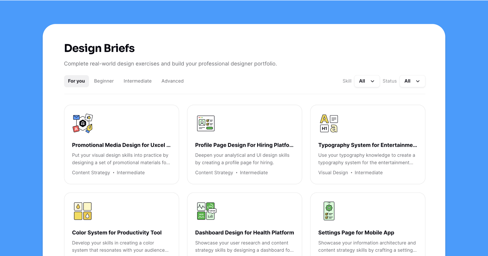 - Explore the design briefs offering scenarios for design works. This option is ideal for those who don't have a portfolio, are beginners, or are changing their careers and want to gain skills and upgrade their portfolios. By following a design brief, you can create a project that demonstrates your ability to tackle specific design challenges.