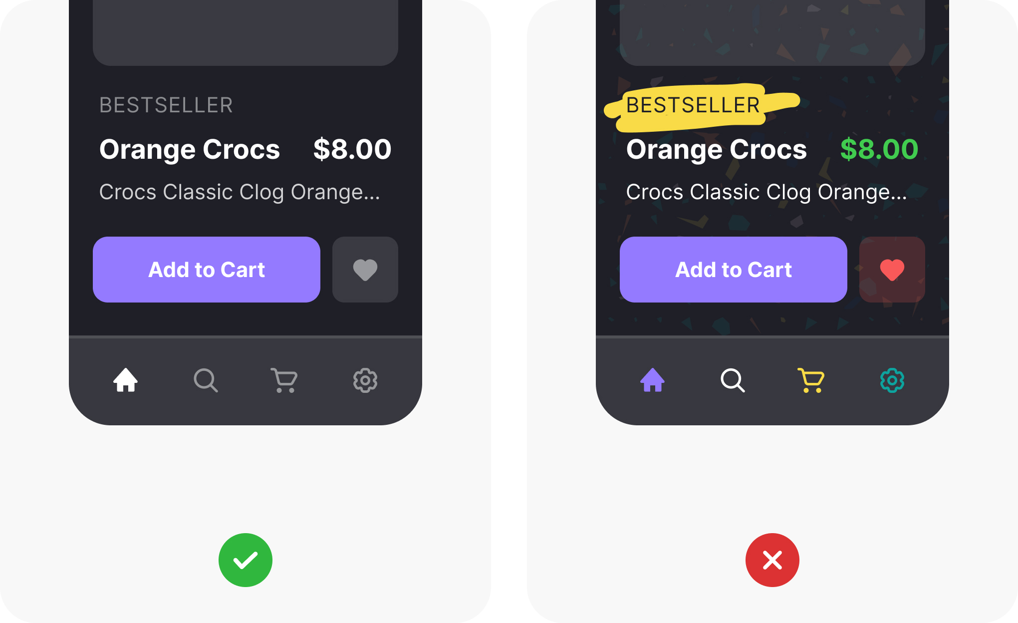 When designing a product, it's important to remember that functionality always comes first. Less is more, and if an element doesn't help users achieve their goals — get rid of it. For example, avoid intense colors, imagery, or ornamental details that don't add value to the product's functionality.