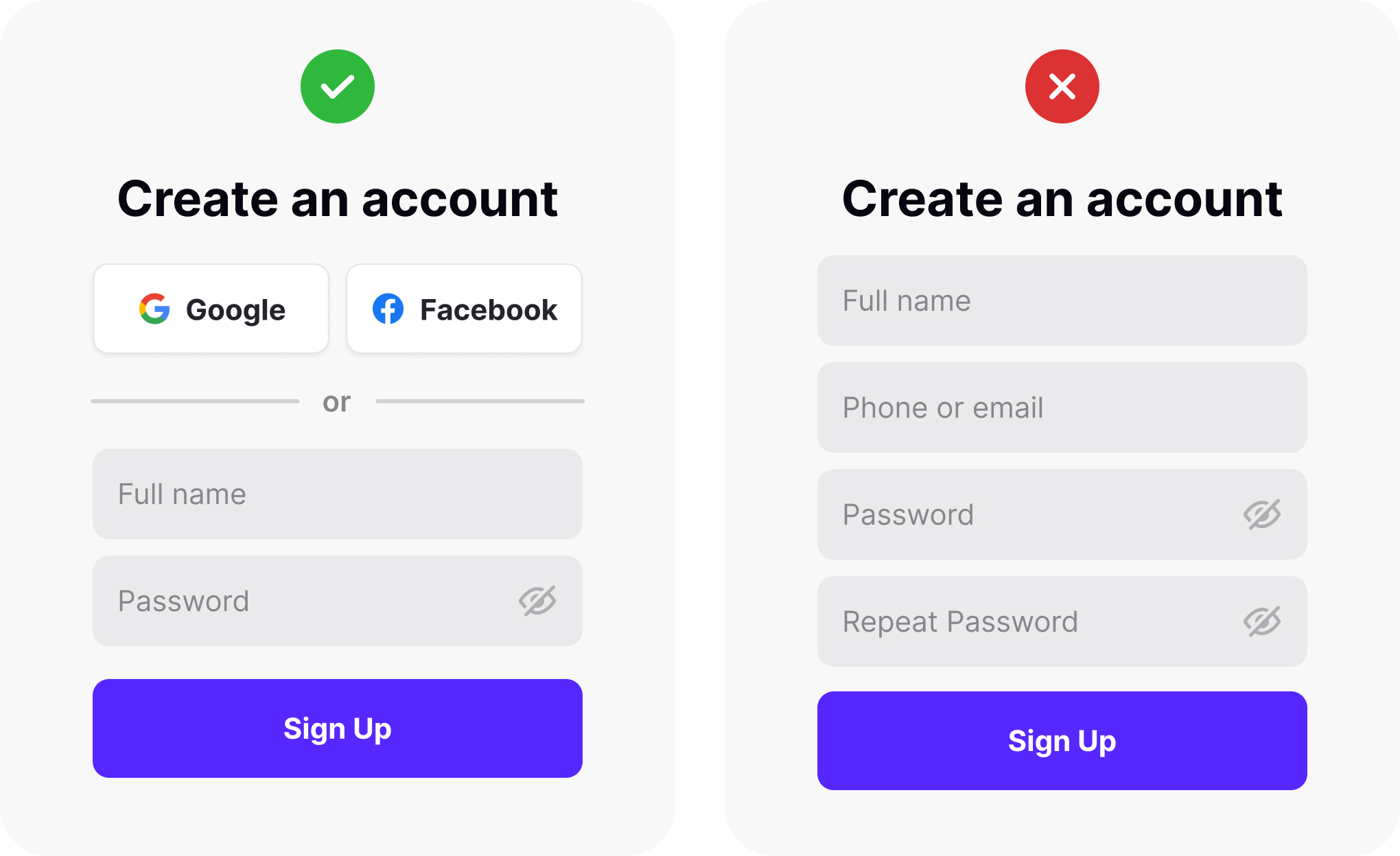 - Allow signing in from third-party services: When users have just started using your product, don't scare them off with a lengthy sign-up process. Instead, provide a quick registration with third-party services like Google or Facebook.