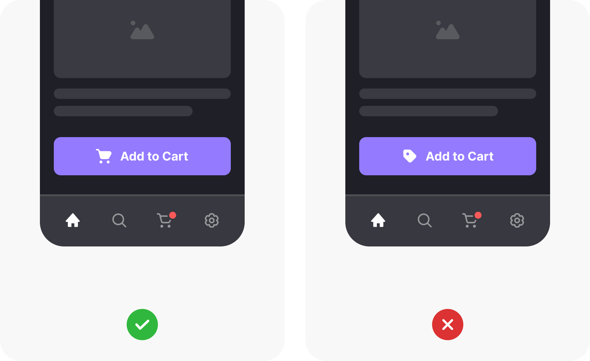 - Accompany icons with labels. Universal icons are the best, but they don't cover all possible actions. Using unique icons together with labels eliminates ambiguity and clearly communicates their meaning.