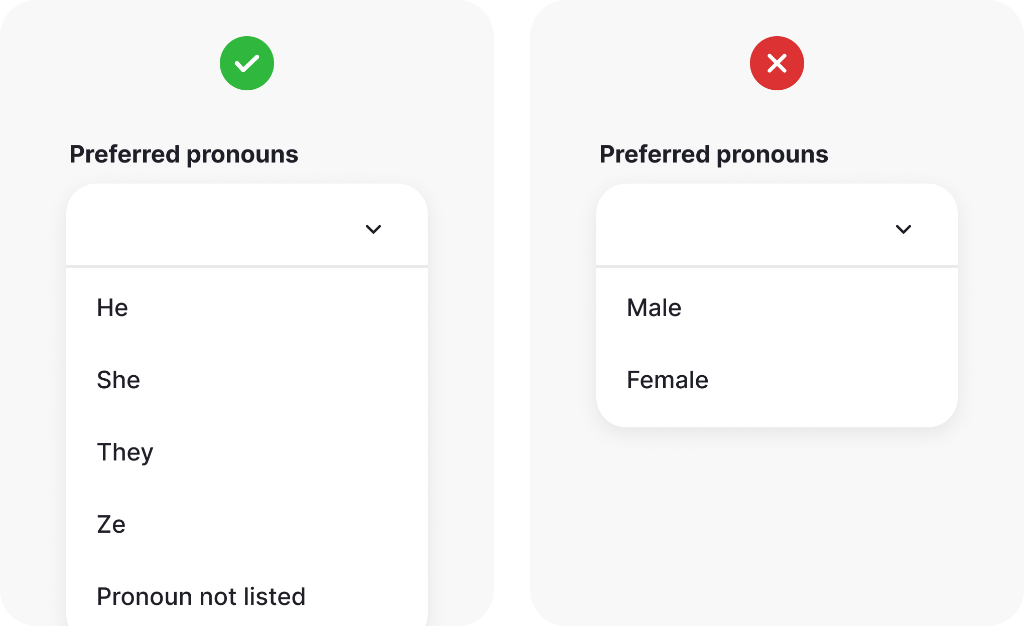 - Exclusionary design: Designing for a specific user group without considering inclusivity can alienate certain users and hinder the formation of a diverse and inclusive community. An example is asking for gender and providing limited or exclusive options such as “Male” and “Female,” which can alienate or exclude certain users and hinder the formation of a diverse and inclusive community.