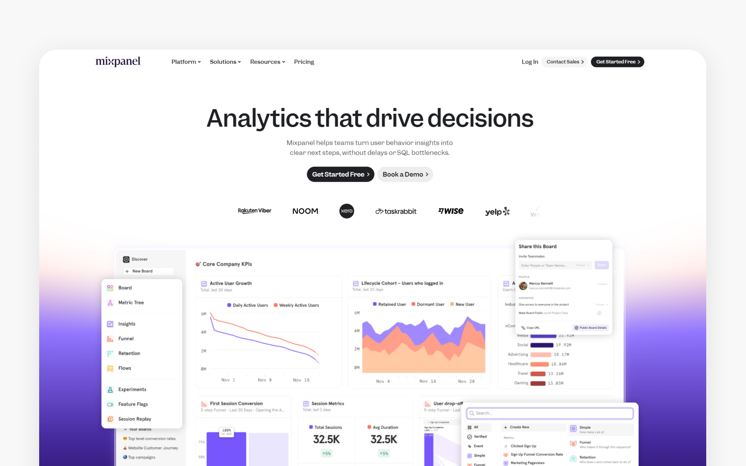 Product analytics and tracking tools (Tableau, Mixpanel, Amplitude, PostHog, Heap, Pendo, LogRocket) show how users behave in your product, which features drive retention, and where people get stuck.
