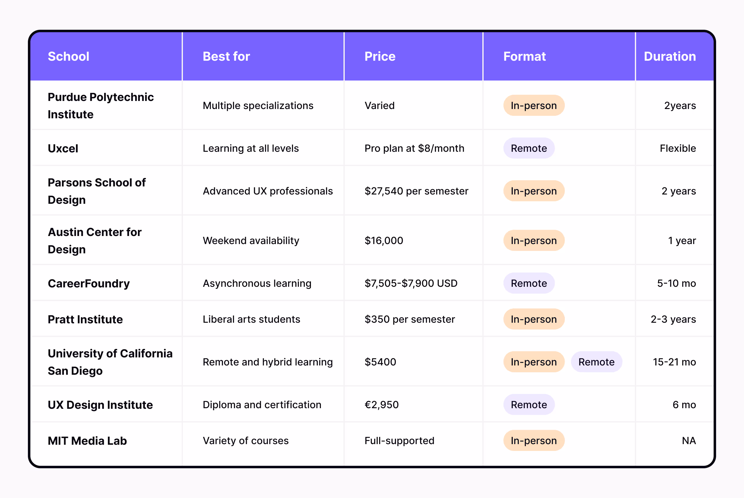 For every school, you'll find all the necessary details about the course(s) to pursue, the learning format, and what kind of UX design students it's ideal for.