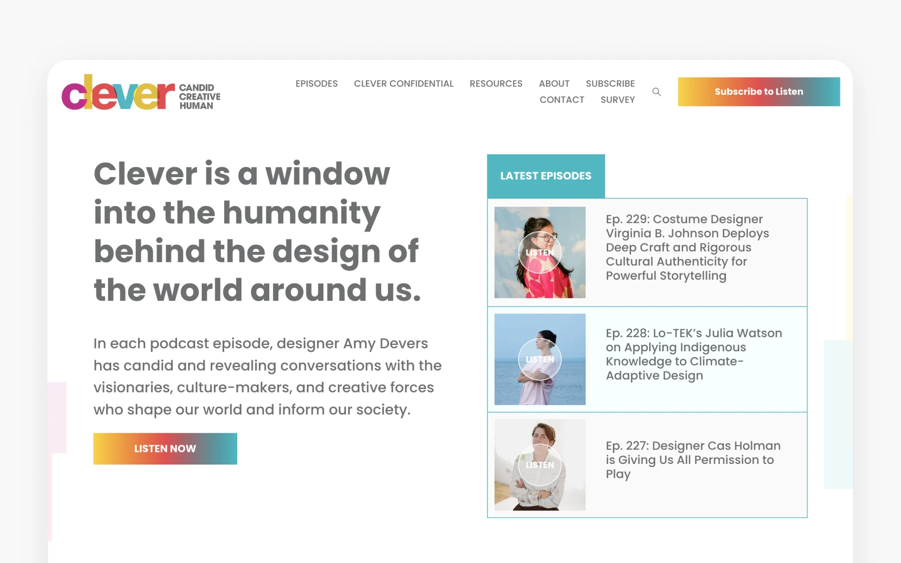 The Clever podcast is a go-to show for those looking for more candid and in-depth conversations with people that stand behind the design of objects and environments that shape our lives. Each episode is a revealing chat with design leaders about their childhood dreams and goals, their career journeys and obstacles they met, their failures, successes, and future plans.