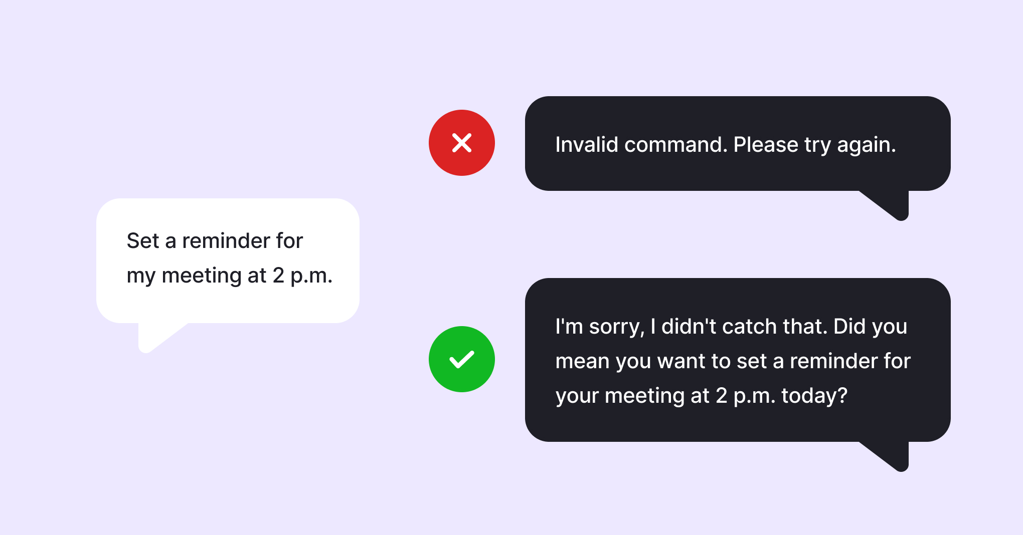 - Provide informative and actionable error messages. Error messages should clearly communicate what went wrong and offer guidance on how to correct the error. Instead of generic error messages, provide specific and helpful instructions. For instance, if a user's speech is not recognized, a message like "I'm sorry, I couldn't understand your request. Please try again, speaking clearly and slowly" provides specific guidance for correction.