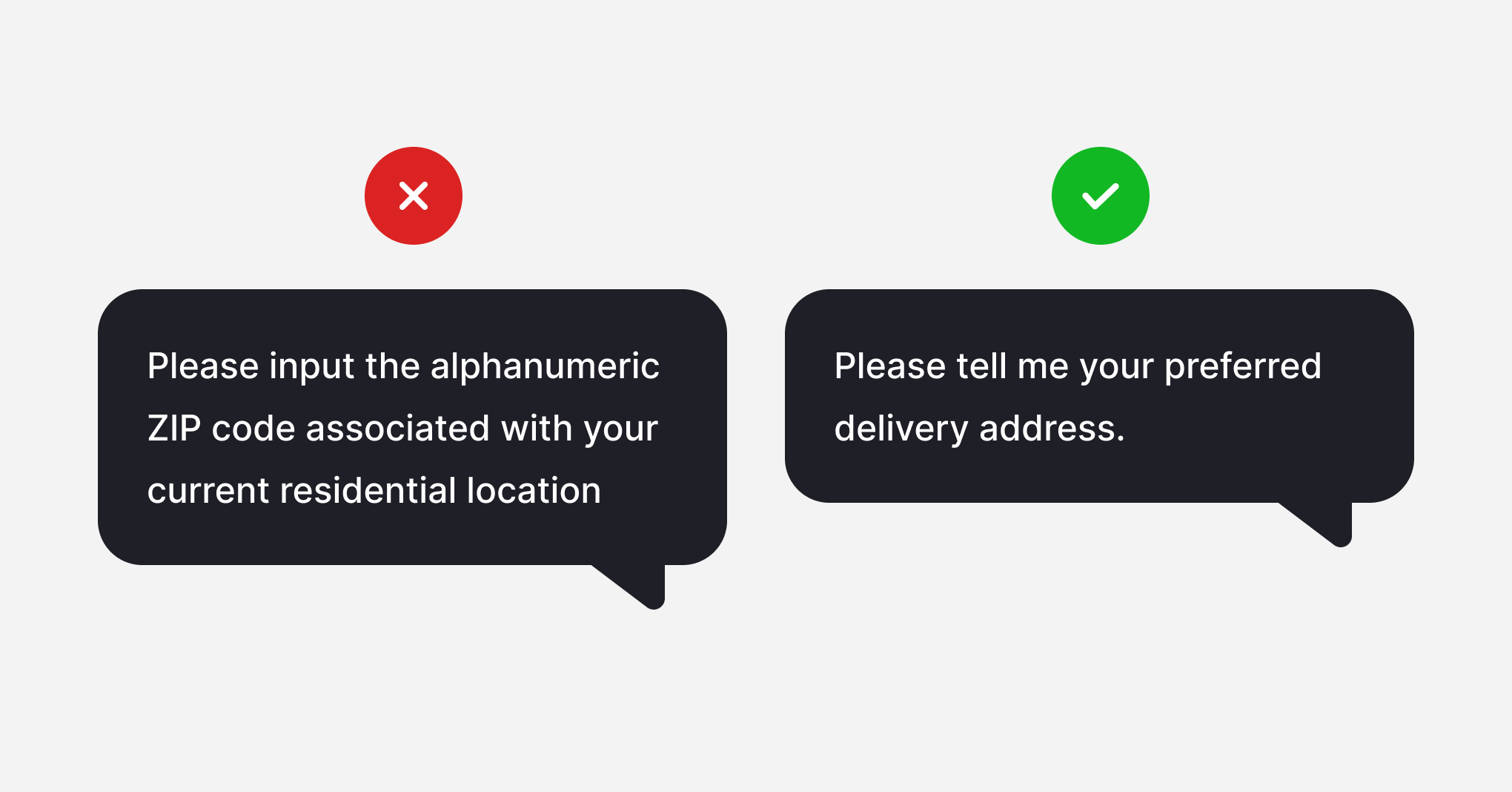 - Use plain language. Avoid technical jargon and complex sentence structures to ensure that prompts are easily understood by users. Opt for simpler language that is clear and straightforward.