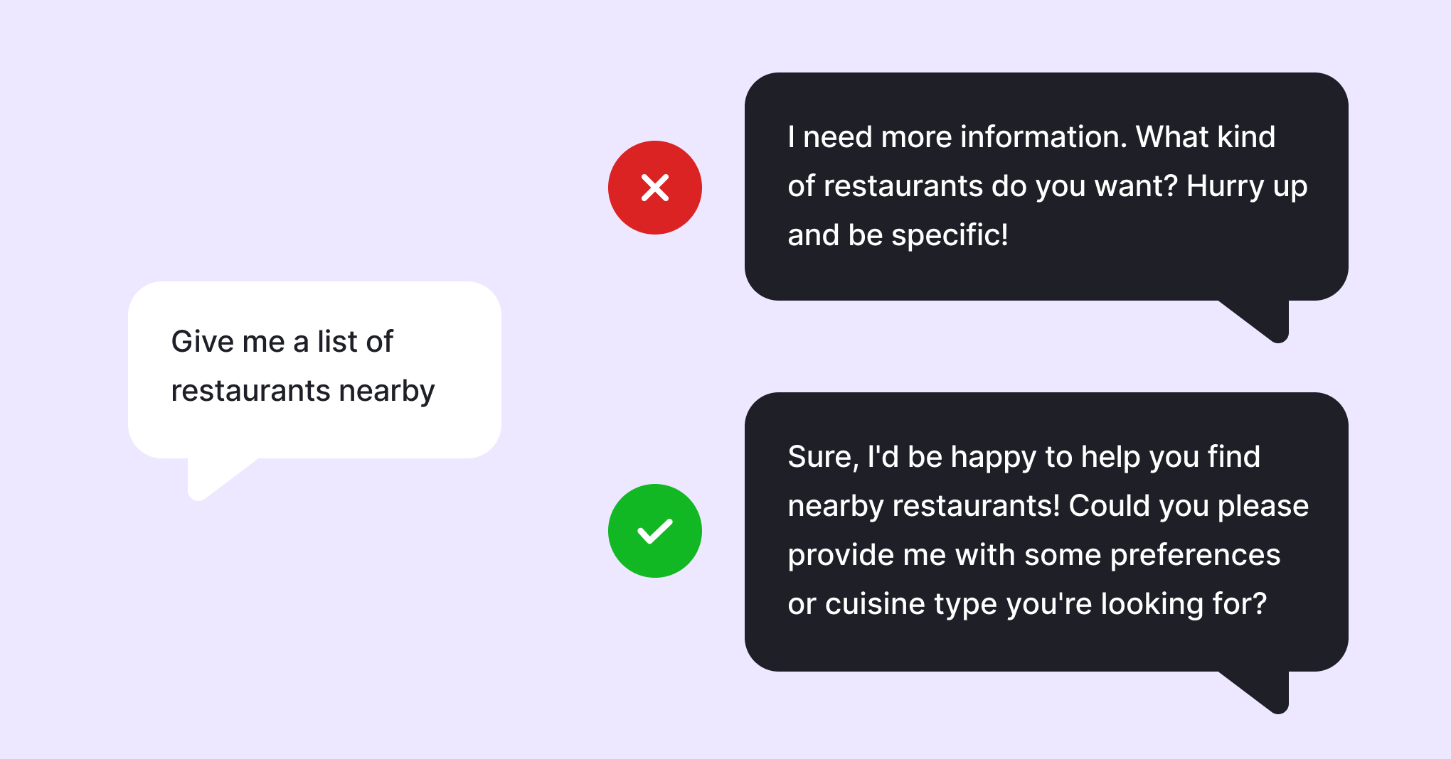 - Adopt a conversational tone. Make the prompts feel like a natural conversation by using a conversational tone. Use contractions, appropriate phrasing, and a tone that aligns with the intended user experience.