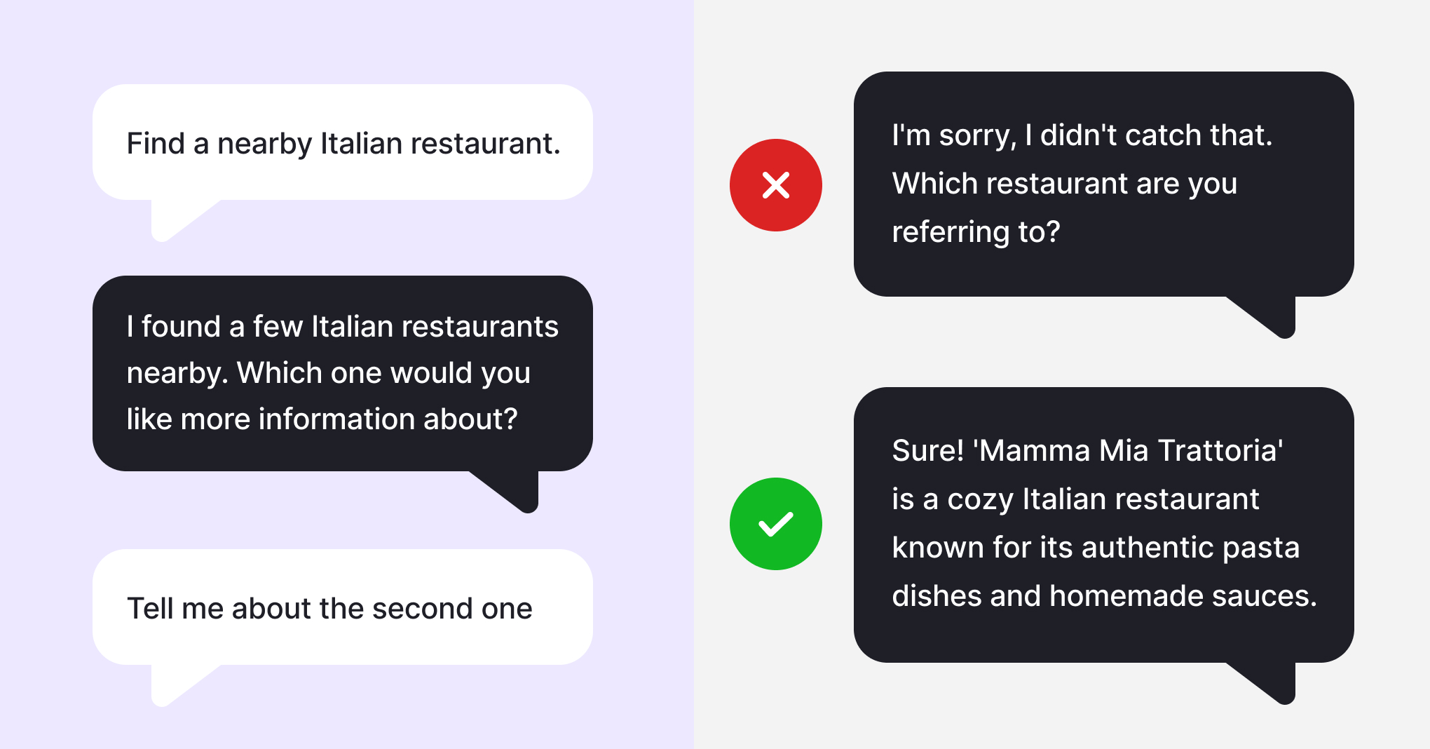 - Remember previous interactions. The VUI should be capable of recalling user inputs, responses, and context from earlier parts of the conversation. This allows for continuity and context-aware responses. For example, if users ask about the weather in New York City and then follow up with "What about tomorrow?" the VUI can recognize the context and respond with the forecast for the next day in New York City.