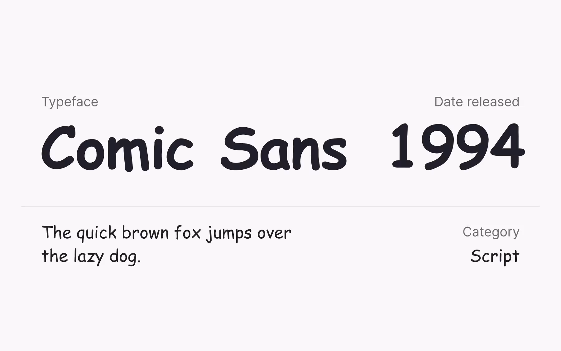 Comic Sans MS is a script typeface created in 1994 by American designer Vincent Connare for Microsoft. It draws inspiration from comic books’ letters and looks like written by a small child. Each letter in Comic Sans is designed to mimic the playful, informal style of comic book handwriting, emphasizing the unique shapes and forms found in hand-drawn scripts. For better or worse, the typeface became the target of criticism and even hatred for its misuse and exaggerated simplicity. As Connare stated himself, “If you love it, you don’t know much about typography, [but] if you hate it, you really don’t know much about typography either, and you should get another hobby.”