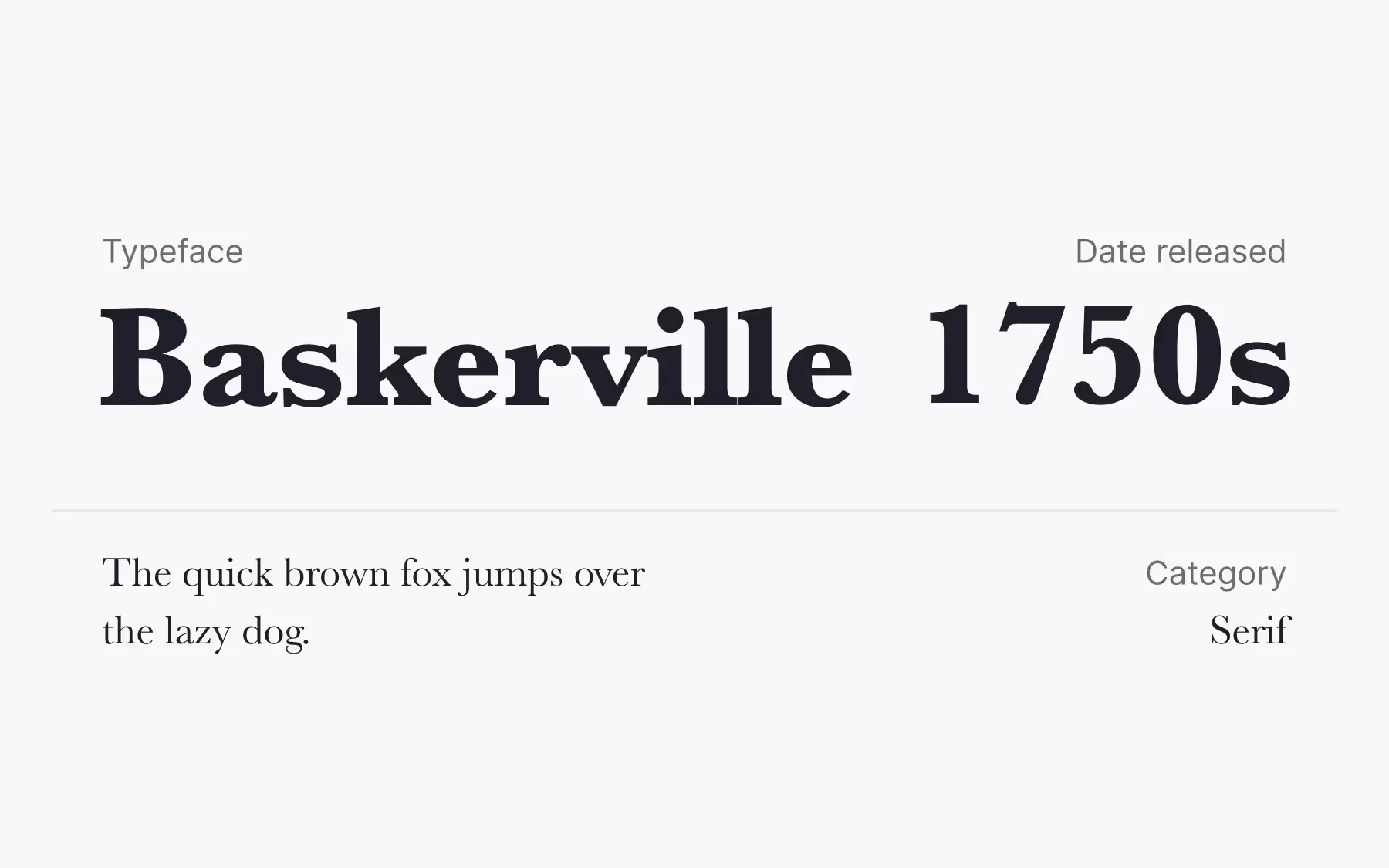 Baskerville is a serif typeface created in the 1750s by an English designer John Baskerville. It was revolutionary for its time as it increased the contrast between thick and thin strokes and had a stronger personality due to its rounded strokes. Baskerville is a prime example of serif fonts that evolved from traditional stone carving techniques, where the serifs originated from the chiseling process rather than purely aesthetic design.