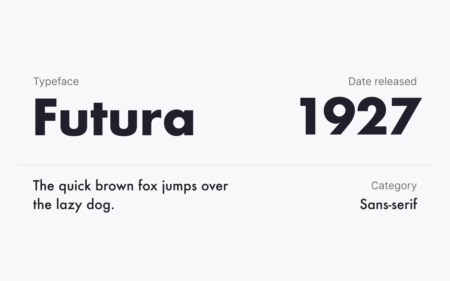 Inspired by the Bauhaus design philosophy, German designer Paul Renner created Futura — a geometric sans-serif typeface stripped of unnecessary serifs and frills. You can say that this typeface represents the belief in functionality over aesthetics. Futura’s letterforms are notably squarish, giving the typeface a geometric and modern appearance.