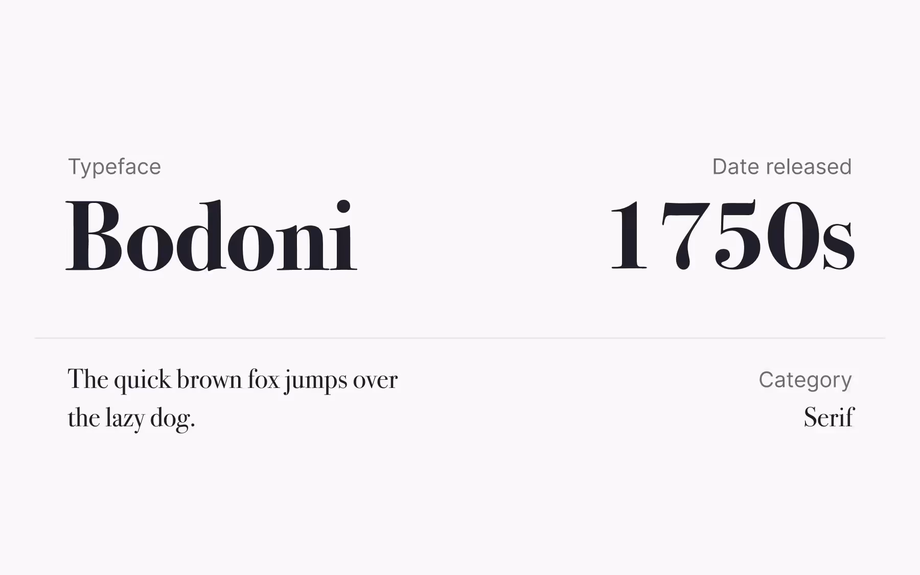 Bodoni is a serif typeface created by an Italian typographer and type designer Giambattista Bodoni in the late eighteenth century. There have been numerous revivals since its creation — the two most successful are ATF Bodoni and Bauer Bodoni. Bodoni produces a striking visual effect through its high contrast between thick vertical and thin horizontal strokes, a hallmark of Didone typefaces.