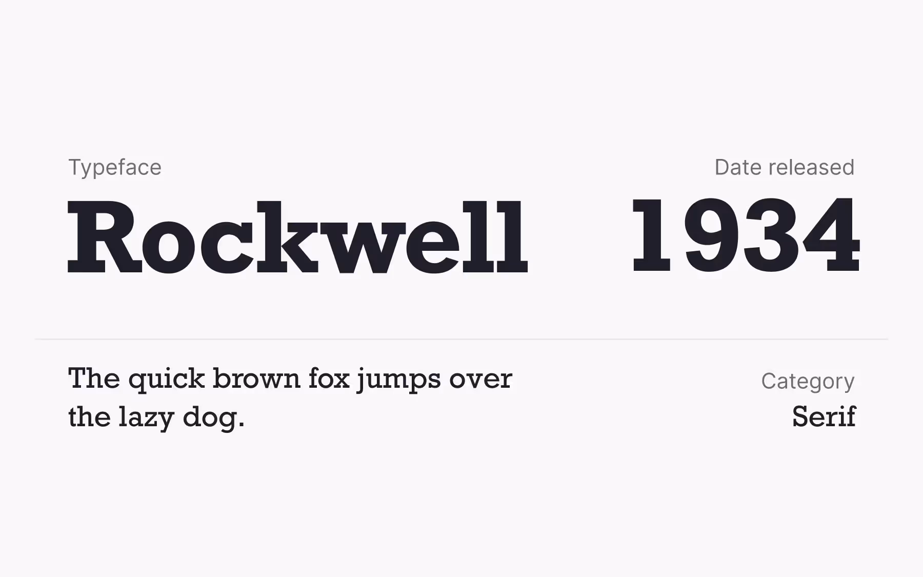 An updated version of 1910’s Litho Antique, Rockwell was released in 1934 by an American company Monotype Imaging. It became one of the most popular geometric slab-serif typefaces constructed almost entirely of straight lines, perfect circles, and sharp angles. Slab-serif typefaces like Rockwell originated at the beginning of the 19th century to meet the demand for attention-grabbing display fonts used in large sizes. Rockwell's block structure stands in contrast to the narrow styles of earlier typefaces, and its bold, almost drawn appearance makes it ideal for impactful headlines.