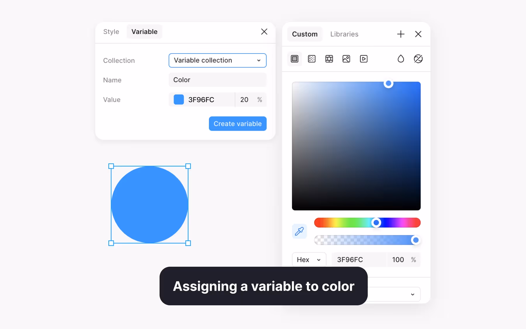 Variables are more granular. They hold single values, like a hex code, a number, or a string, that can be referenced inside styles or components. A button style, for example, might use a color variable for its background and a text variable for its label. Updating those variables updates every style or component linked to them.