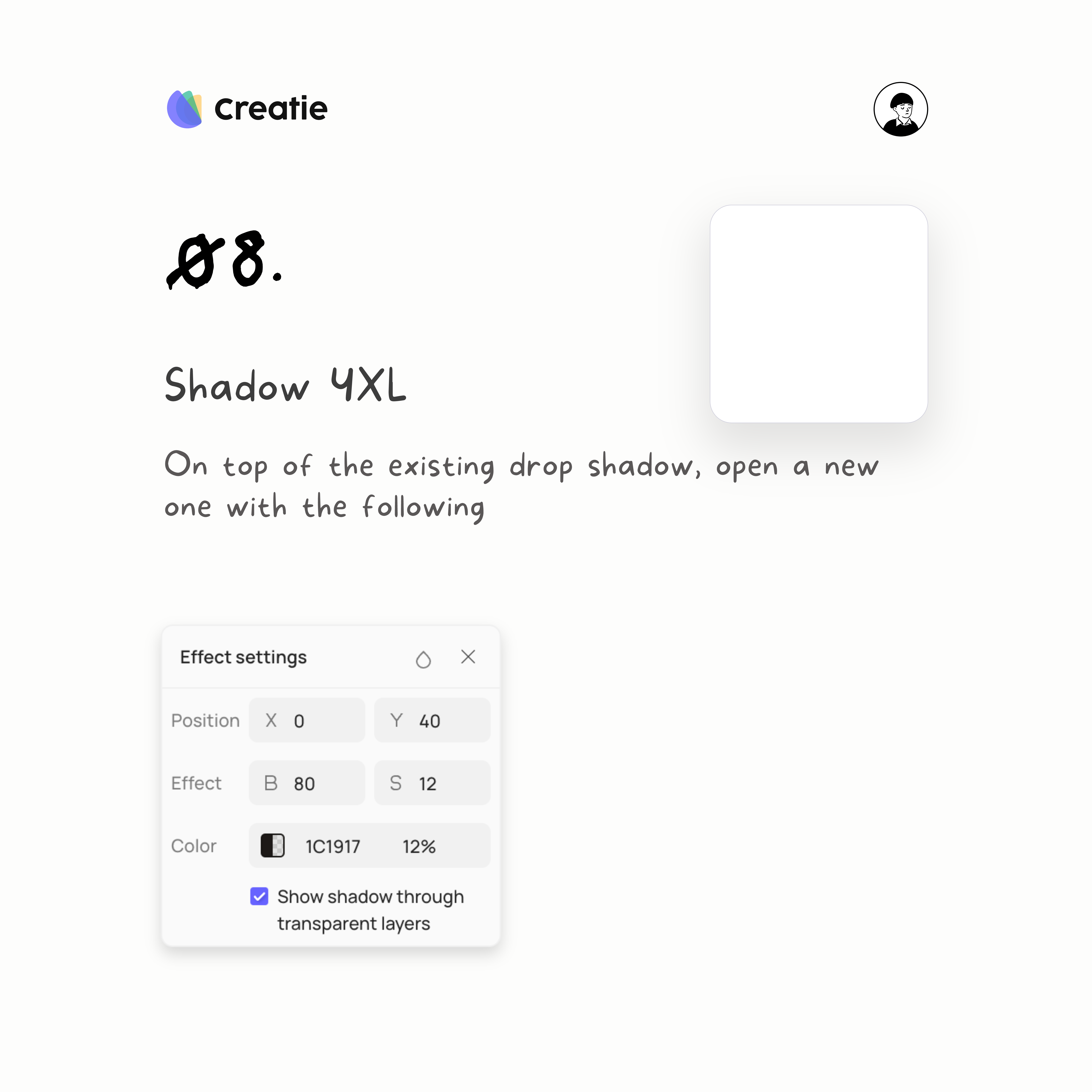 #1C1917with an opacity of12%. - Transparency: Ensure "Show shadow through transparent layers" is checked to maintain a soft, natural appearance.