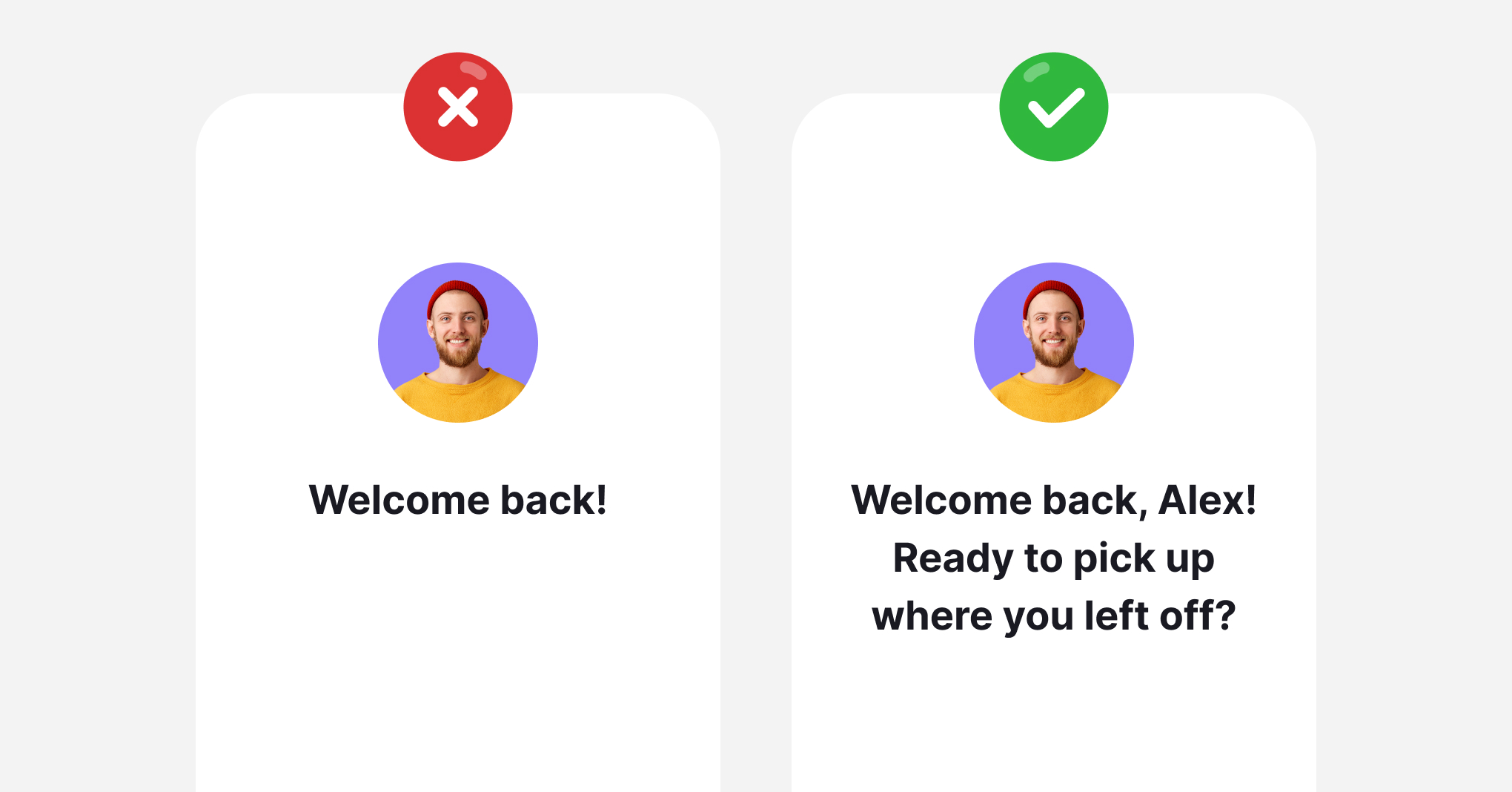 The second example doesn’t just acknowledge users by name; it also suggests continuity in their experience, making them feel seen and understood. Personalization can also involve using data to customize content, such as showing relevant recommendations or addressing specific user behaviors.