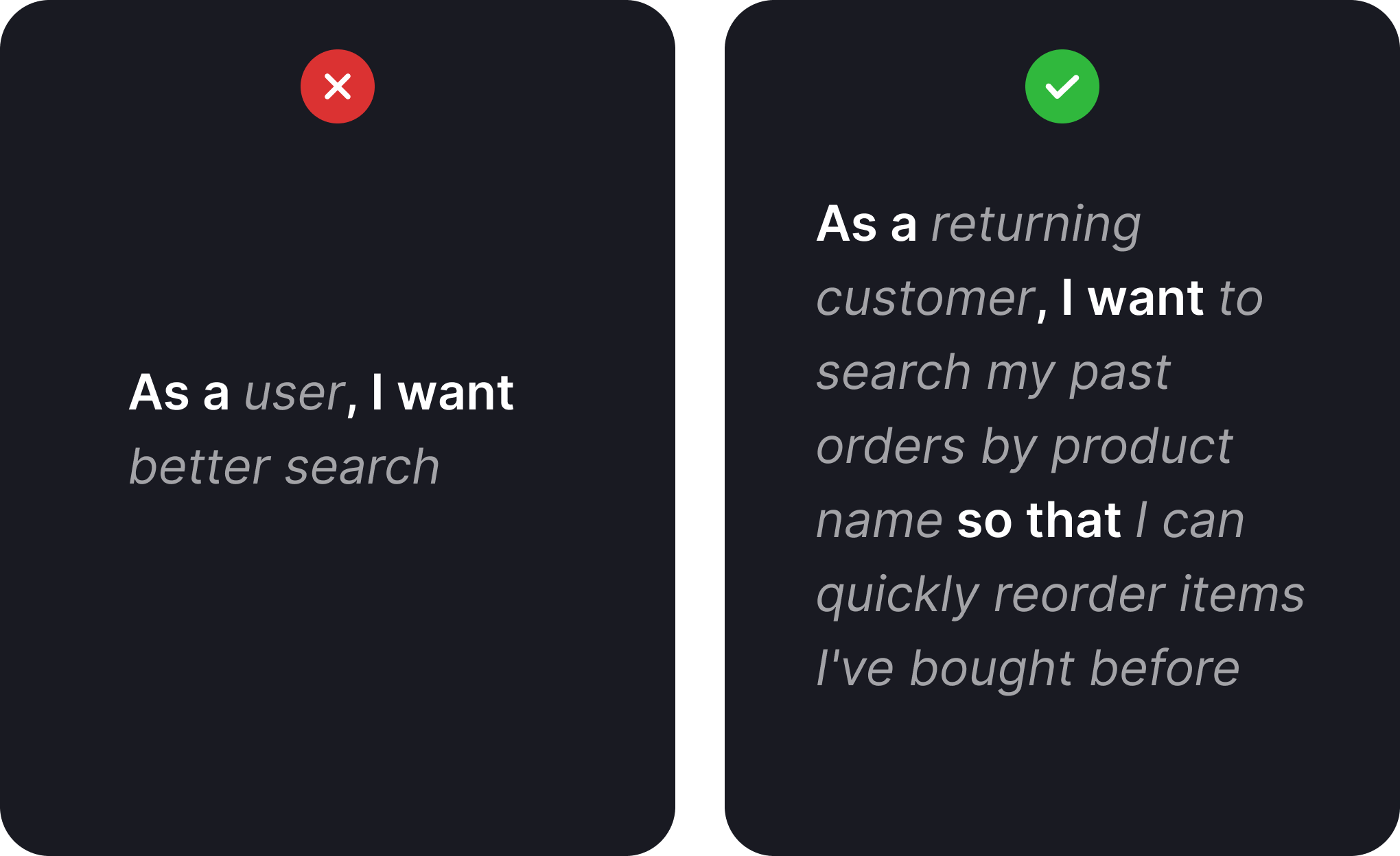 - They're genuinely user-focused: Not "As a product manager, I want reports" but "As a team lead, I want to see my team's velocity trends so I can spot bottlenecks before they impact our deadline."
