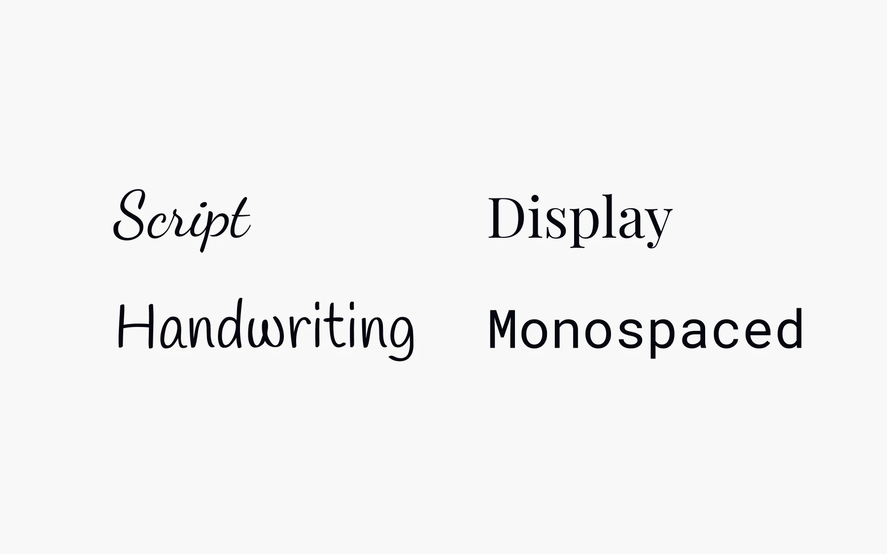 Script typefaces vary widely and can evoke anything from a very feminine, laid-back feeling to a very formal feeling. They’re suitable for headlines, titles, and logos, but don’t work well in large blocks of text or at small sizes, where they can be very difficult to read. Common examples of script typefaces include Brush Script and Pacifico.