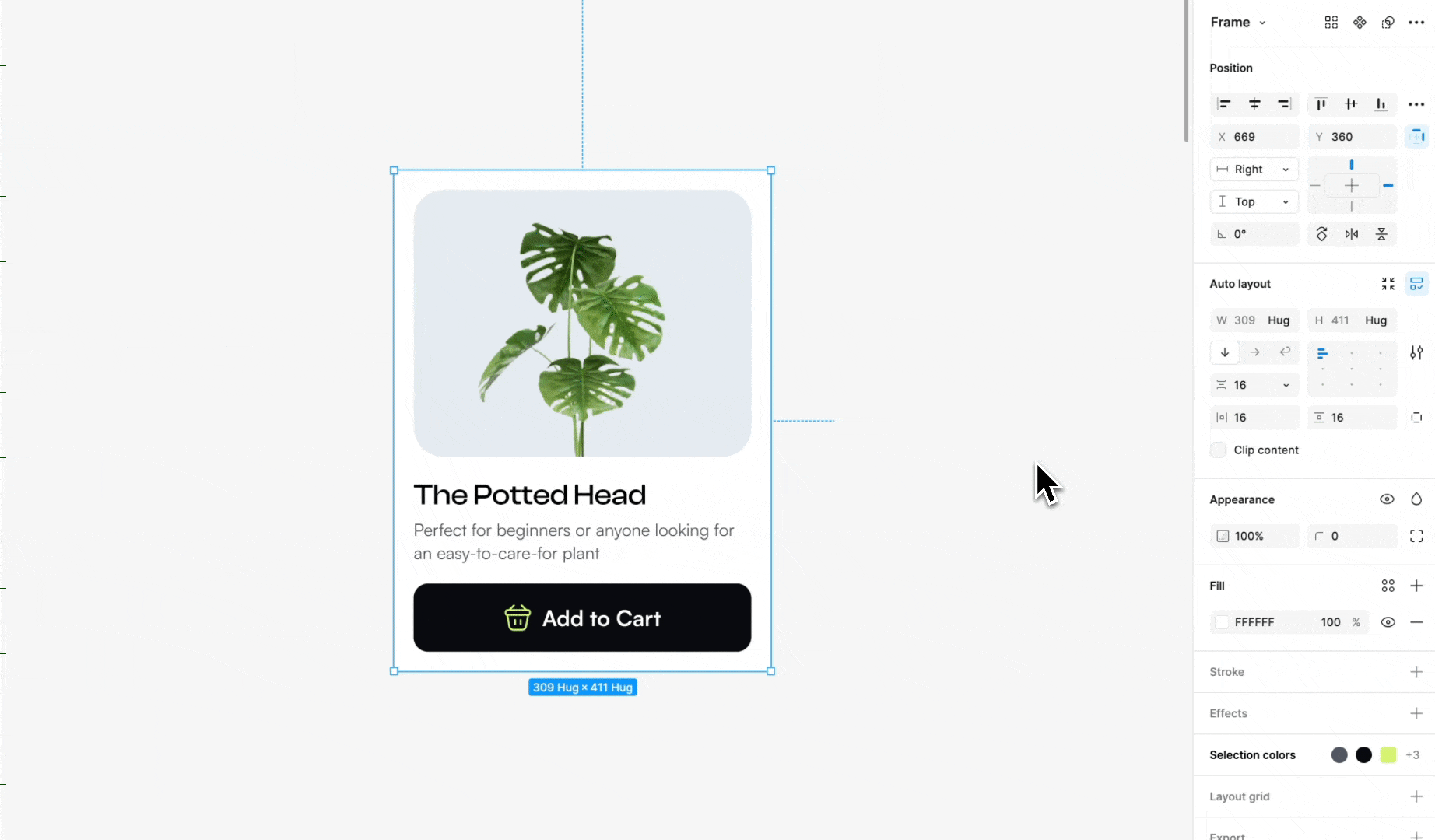 When using Hug Contents, the size of the frame automatically adjusts to fit its content. This means the frame will shrink or stretch to surround all the elements inside. The size of the objects, along with the spacing and padding, will be considered when calculating the frame’s size.