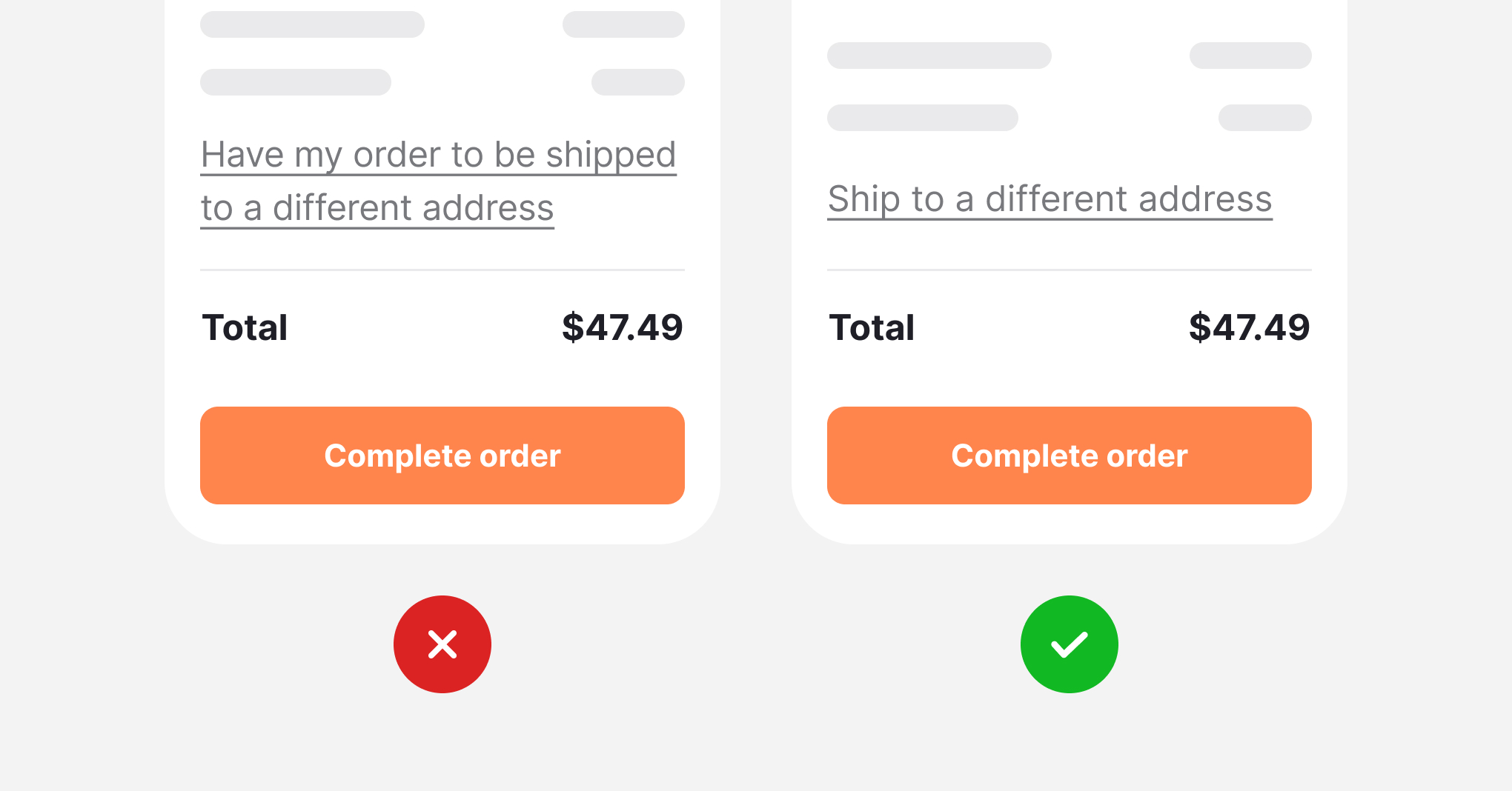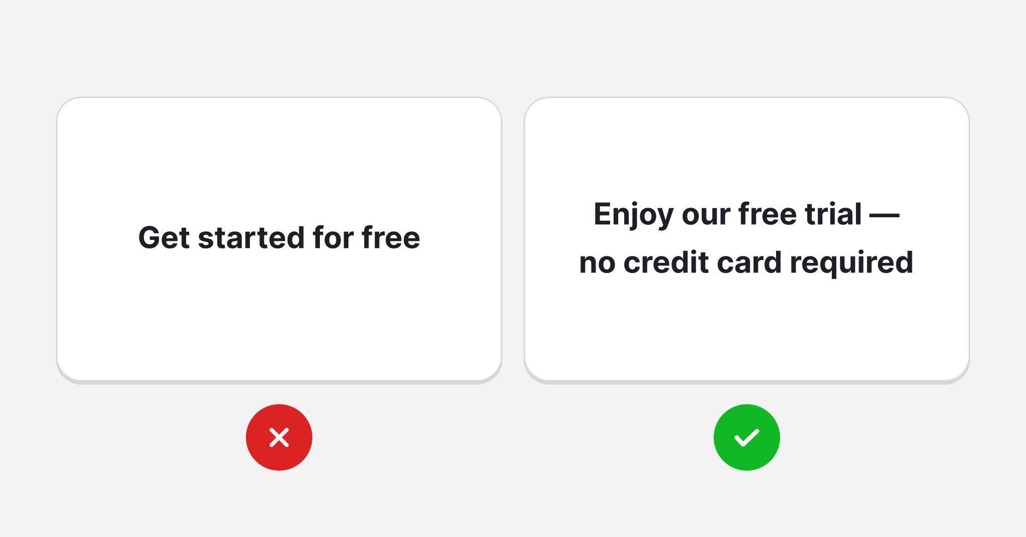 Building trust means being clear and direct. Avoid ambiguous words or double entendres —phrases that can be interpreted in multiple ways. For example, instead of "Get started for free," which might leave users wondering about hidden costs, use "Enjoy our free trial — no credit card required."