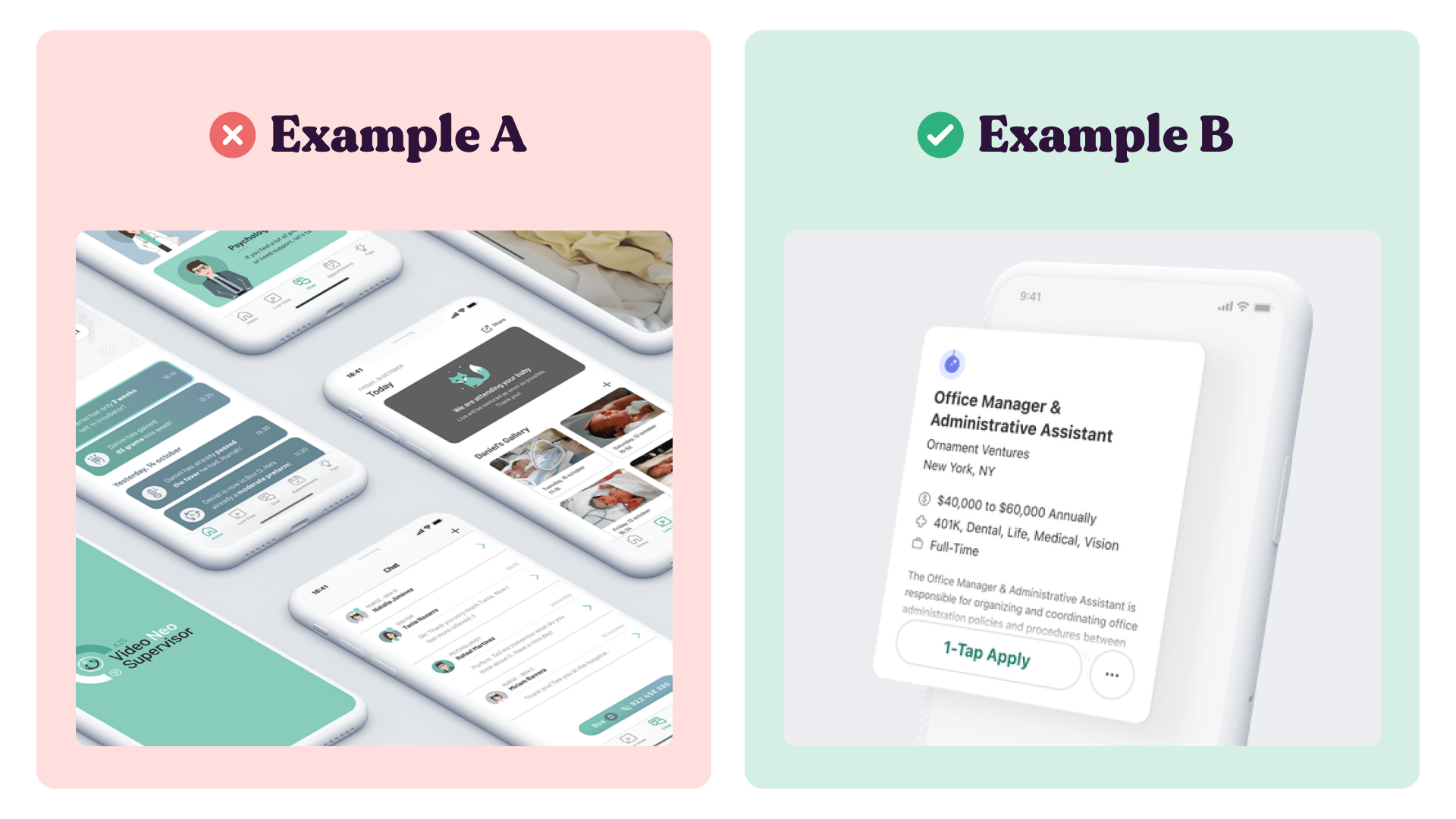 - ✅ Example B: With only one detail you know what is this project about. In this case, it must be related to some job posting. We can also learn enough about the designer's UI skills. Same style, but a better story.