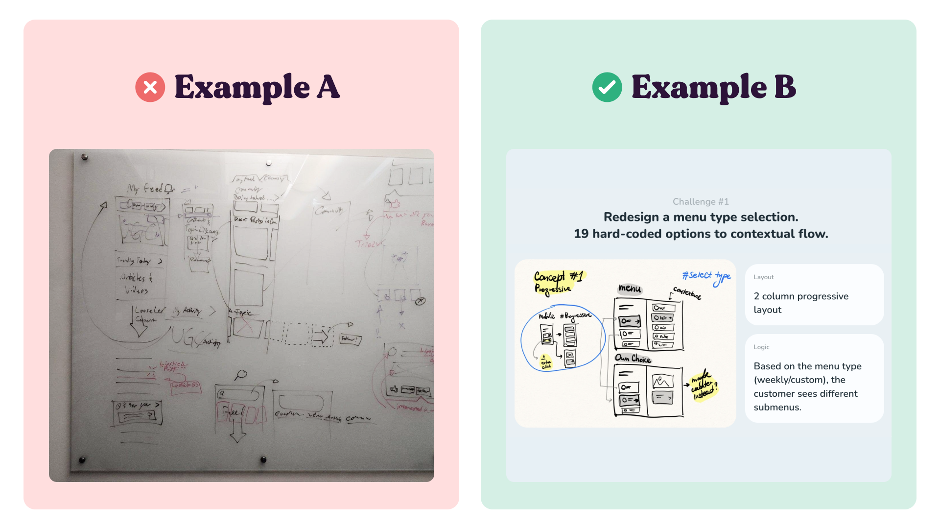 ✅ Explain what you were exploring. Whiteboards are great, but you always need to support them with notes and explanations. Share what directions you were exploring. What ideas you've had in mind? Here is an example from my case study where you can check a way to support your sketches with some notes.