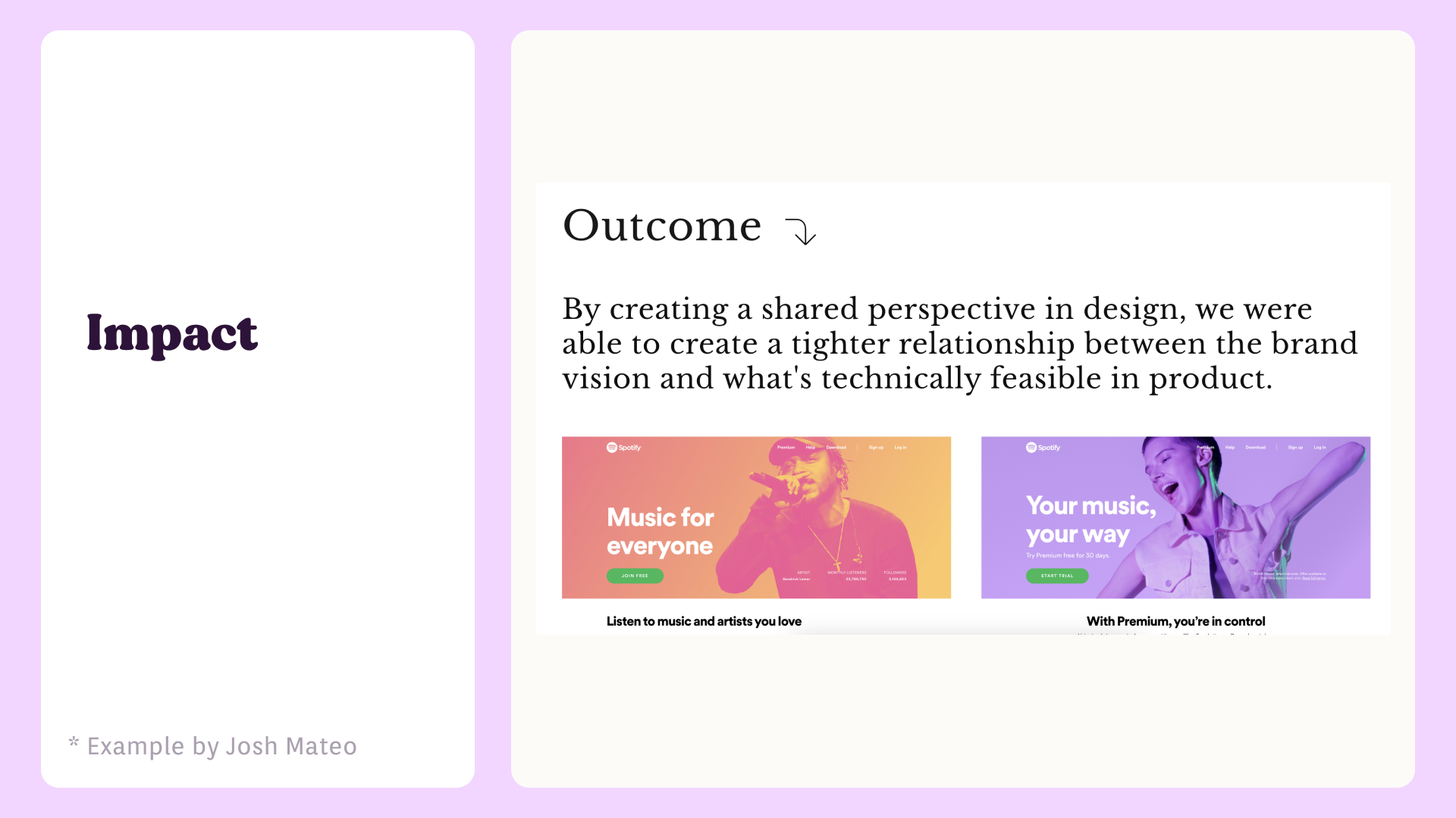 - Alternatively, you can also mention the impact of this project on the company people or process improvements (E.g. Improved the team UX maturity by running cross-functional discovery workshops).