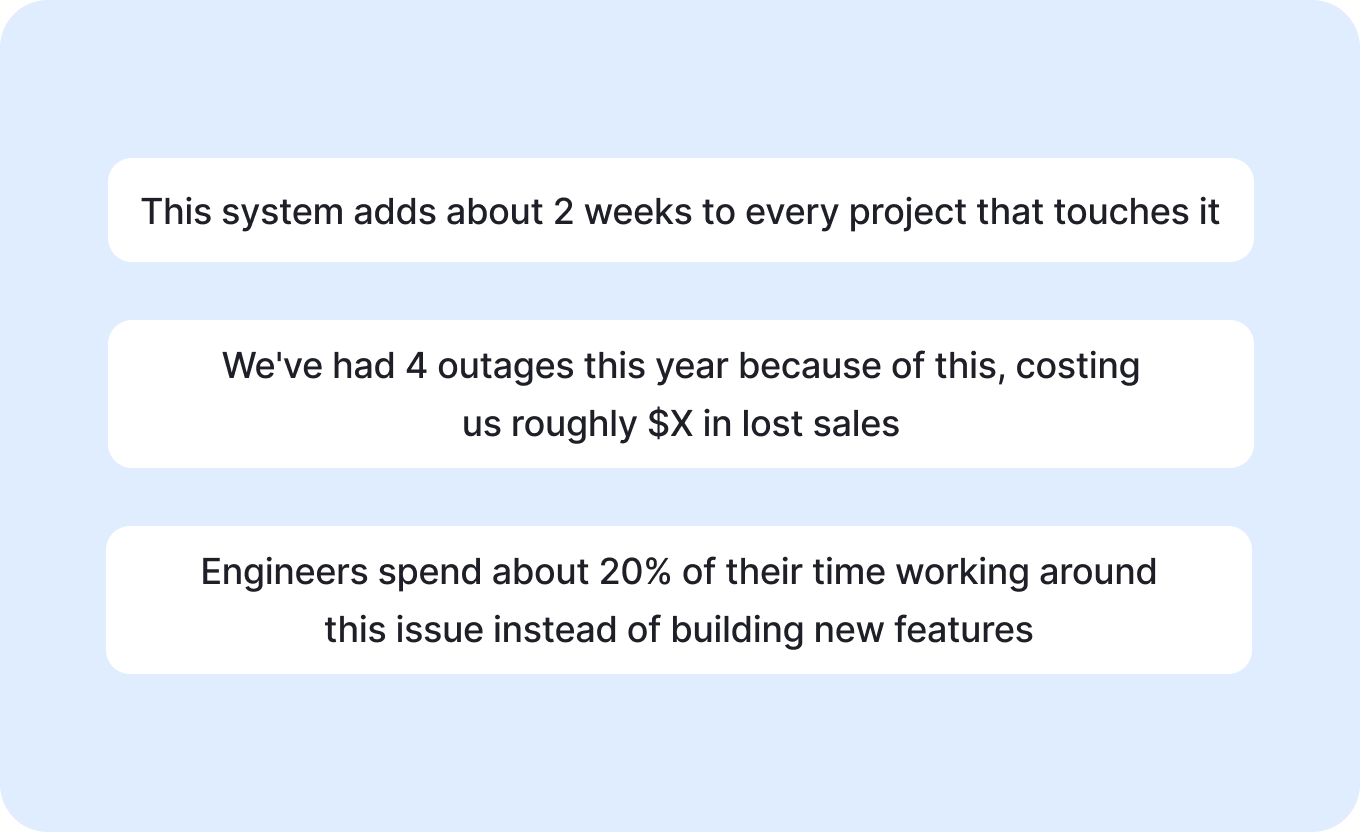 "We have technical debt" is too vague to act on. Instead, identify the specific problems and their specific costs.
