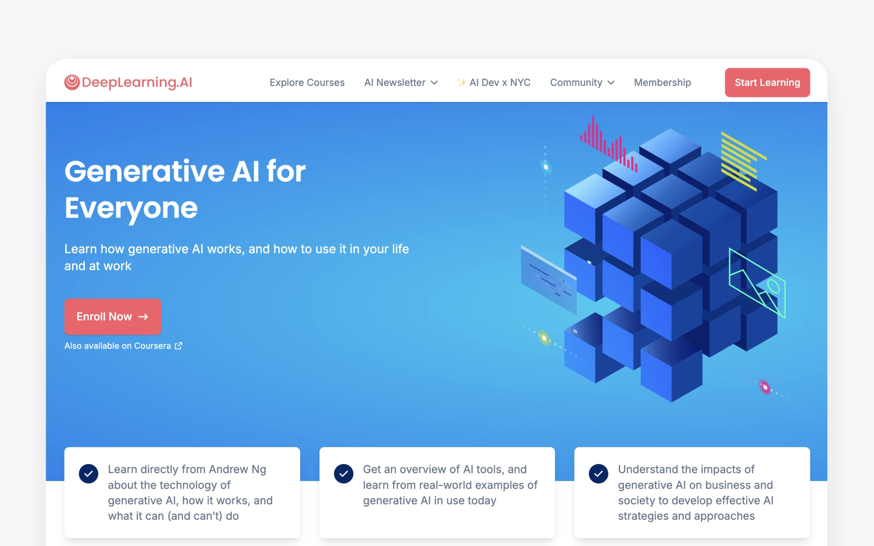 DeepLearning.AI is a respected name in AI education, and Andrew Ng’s involvement gives this course significant authority. While it doesn’t provide technical depth, it offers practical, strategic value in understanding AI’s role in business.