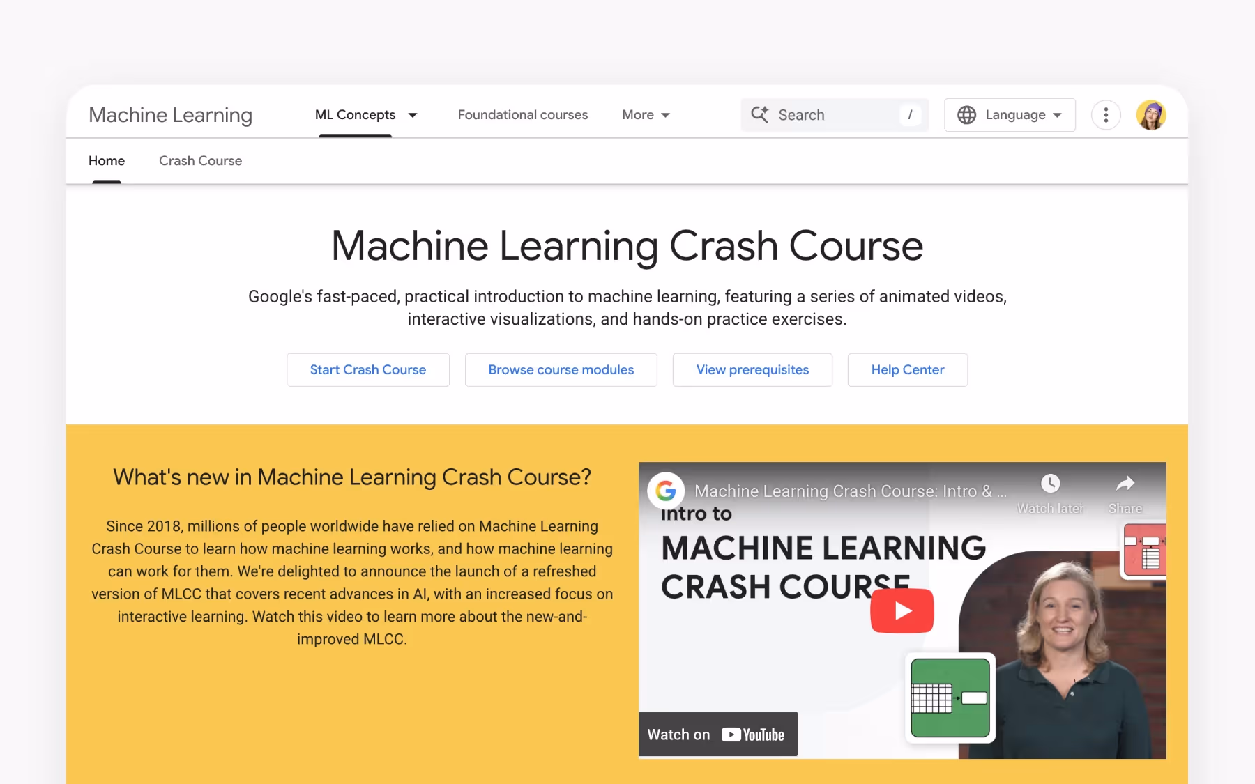 Google’s Machine Learning Crash Course is a free, self-paced resource developed by Google AI. Originally designed for internal use at Google, it’s now publicly available and provides a comprehensive introduction to core machine learning concepts. The course combines short lessons with real-world exercises using TensorFlow APIs, making it one of the most widely used free ML training resources on the internet.