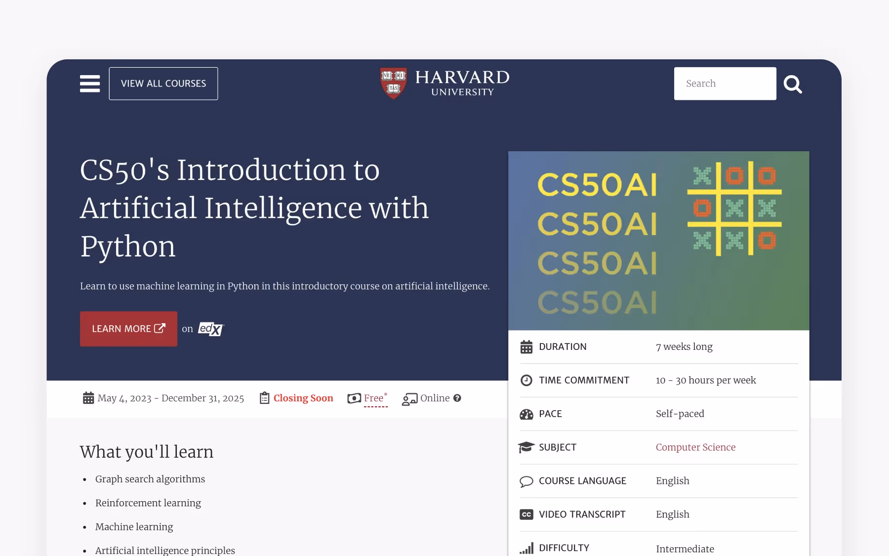 3. Harvard University — CS50’s Introduction to Artificial Intelligence with Python