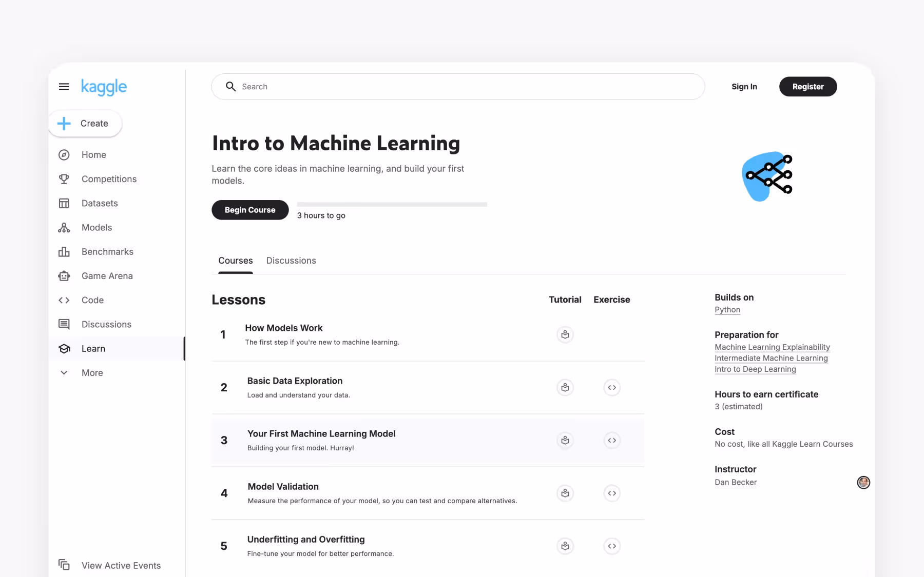 Kaggle, the online data science competition platform, offers a series of free AI and machine learning micro-courses that focus on practical skills used in real data science projects. These micro-courses include “Intro to Machine Learning,” “Intermediate ML,” “Deep Learning,” and more.