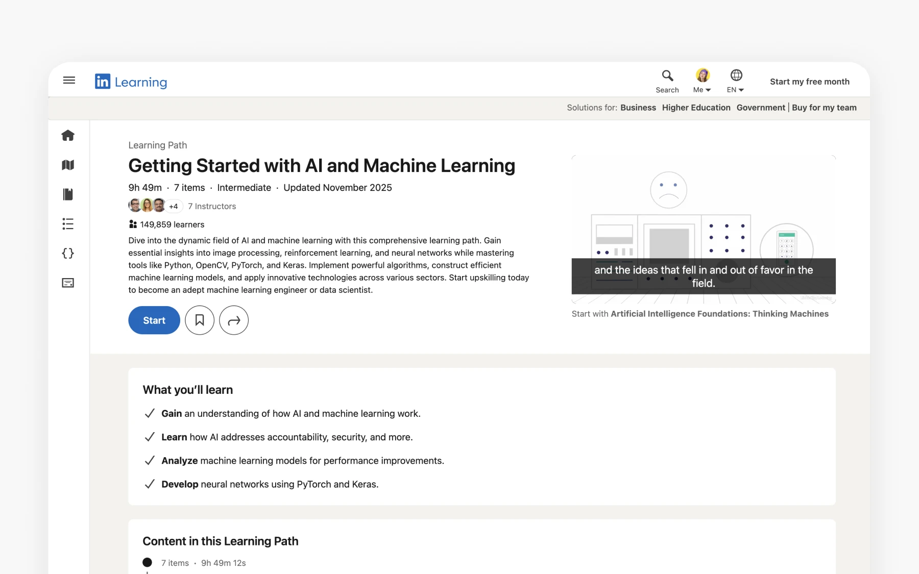 LinkedIn Learning offers several free AI-related courses, including “Getting Started with AI and Machine Learning”. These courses are geared toward business professionals and generalists who want to understand AI basics and how these technologies impact operations, customer service, and decision-making.